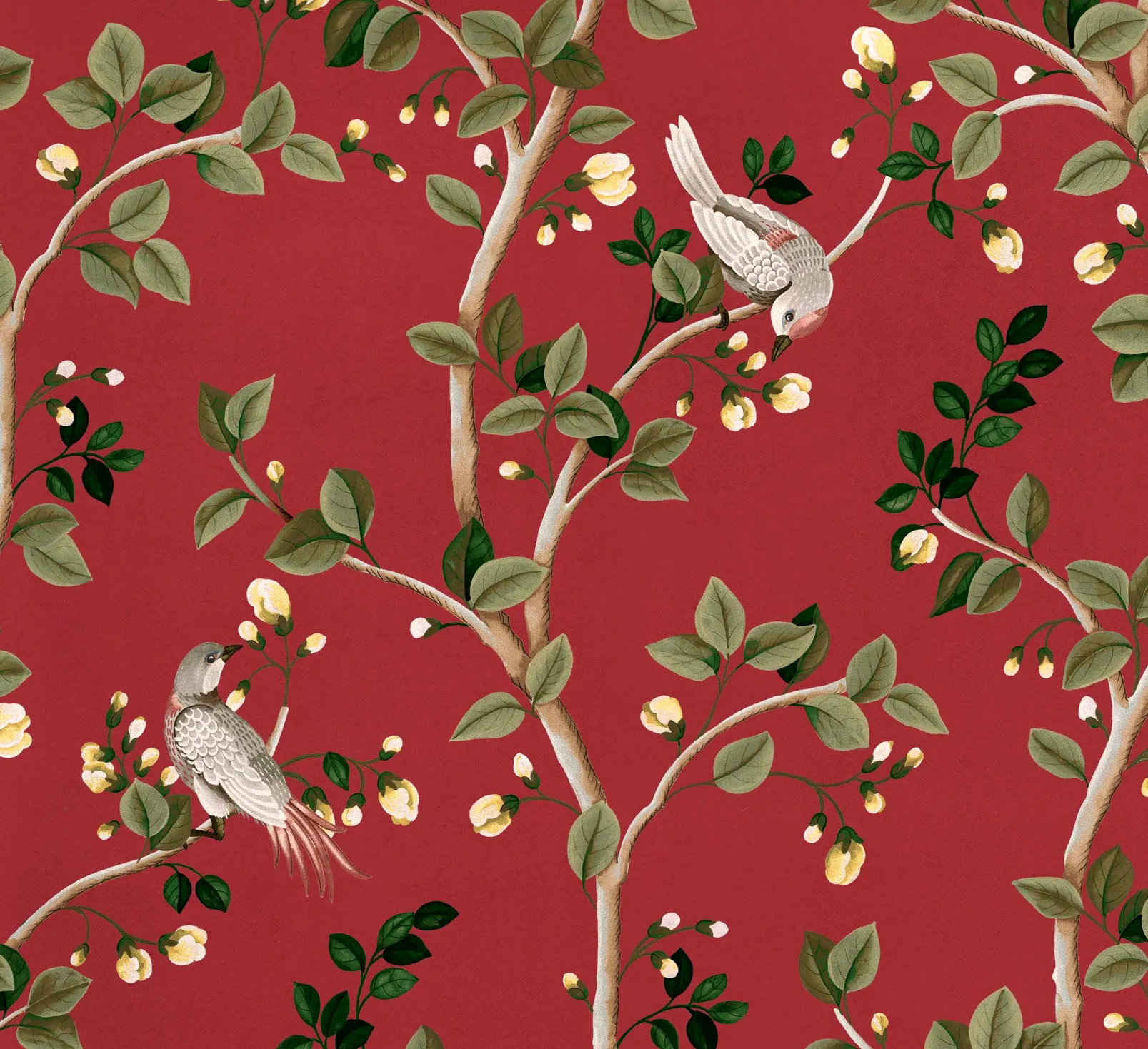 Coordonné’s Birds Prosperity Ruby es un papel pintado rojo/vino. Plumaje que adorna extravagantes banquetes imperiales