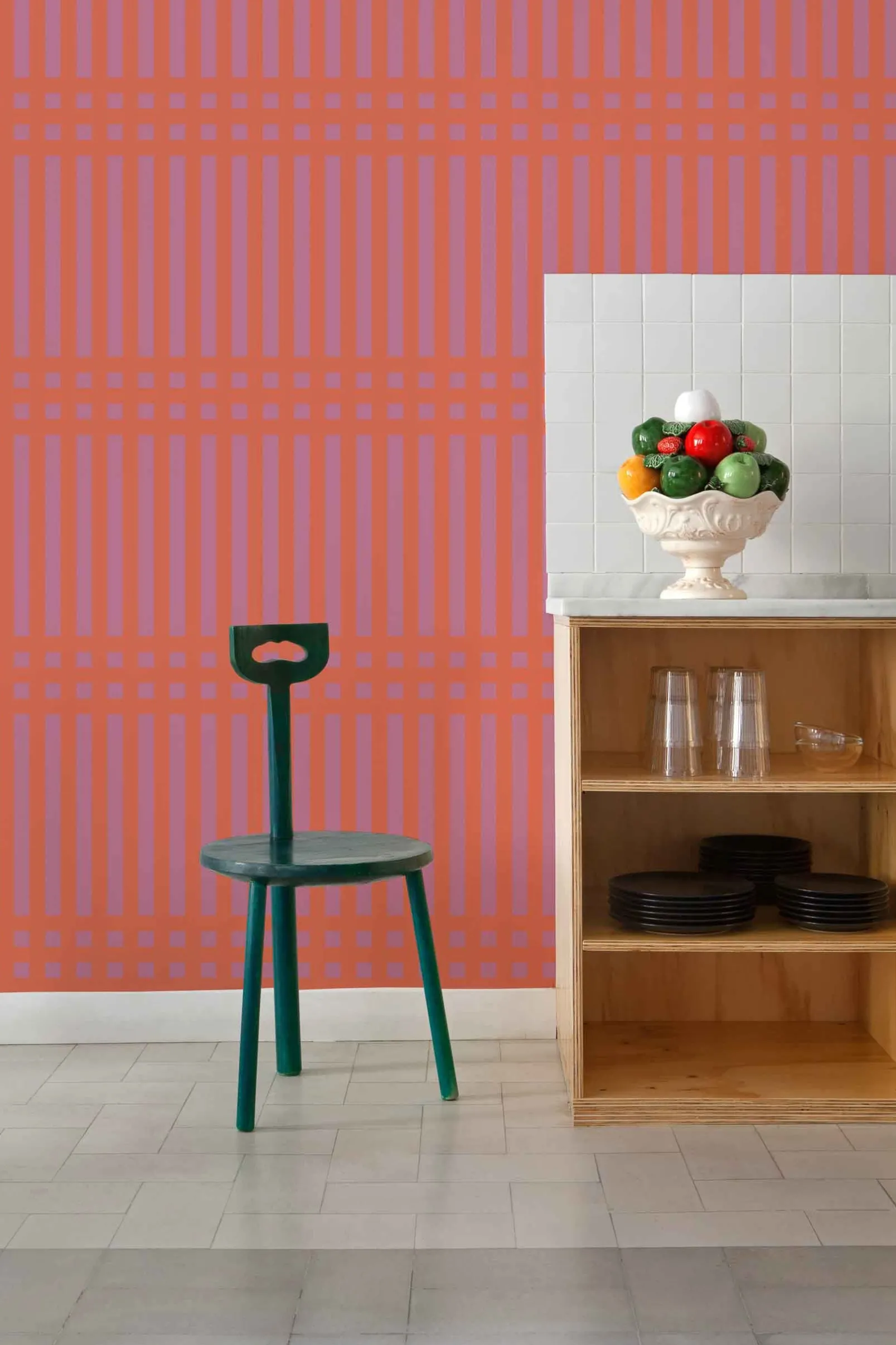 Papel pintado Grids Light Coordonné de la colección 40 aniversario con diseño de rayas en tonos rosa/lila.