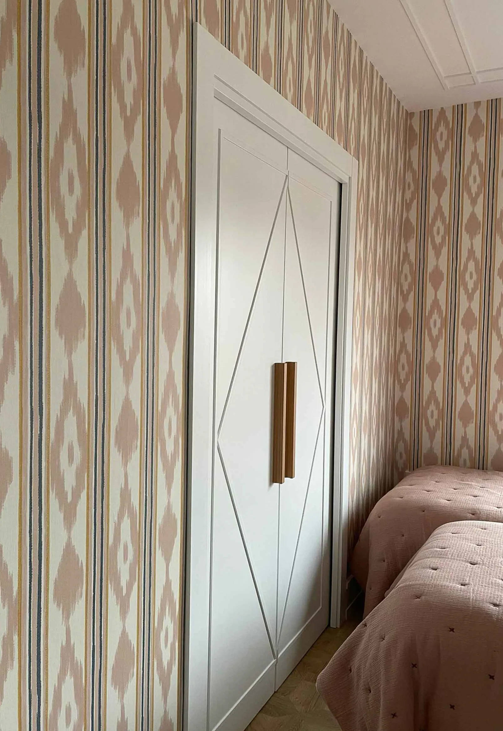 El papel pintado Lloseta Peach de Coordonné es un diseño de rayas en tonos rosa/lila de la colección Mallorca.
