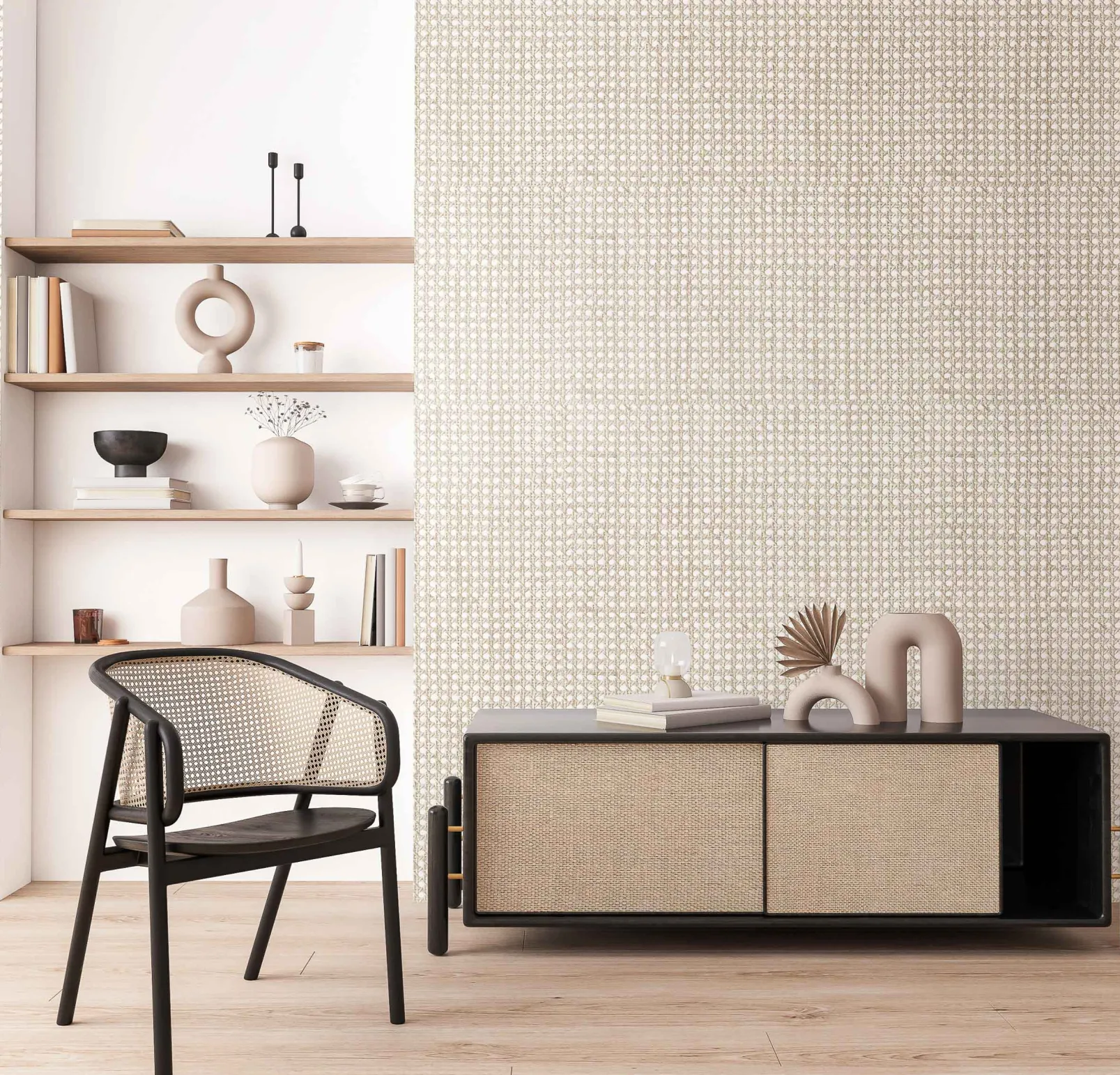 El papel pintado de Coordonné es una textura/material diseñada en tonos blanco/gris de la colección Raffias+.