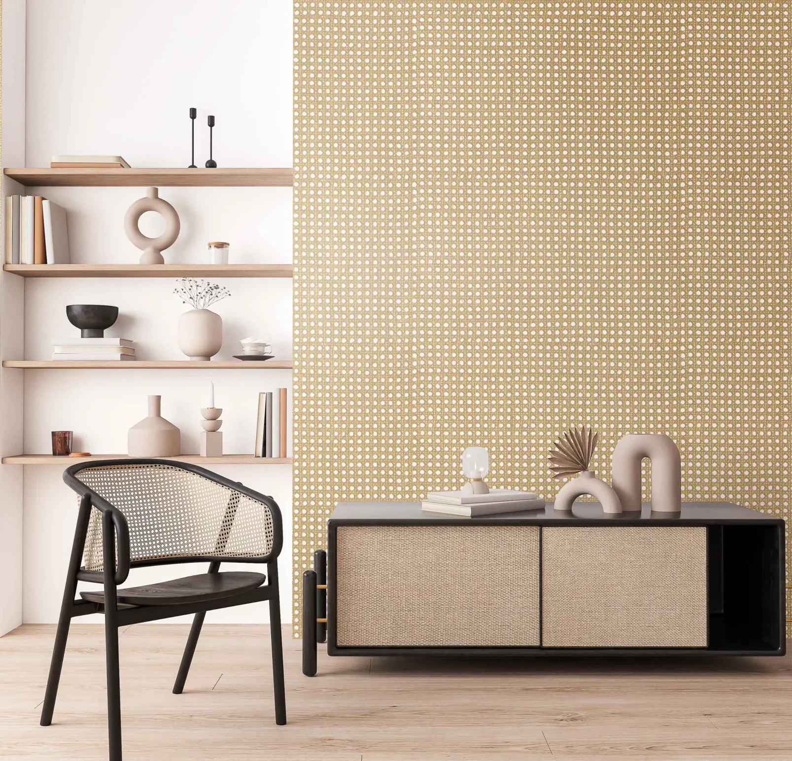 El papel pintado de Coordonné es una textura/material diseñada en tonos Beige/Nude de la colección Raffias+.