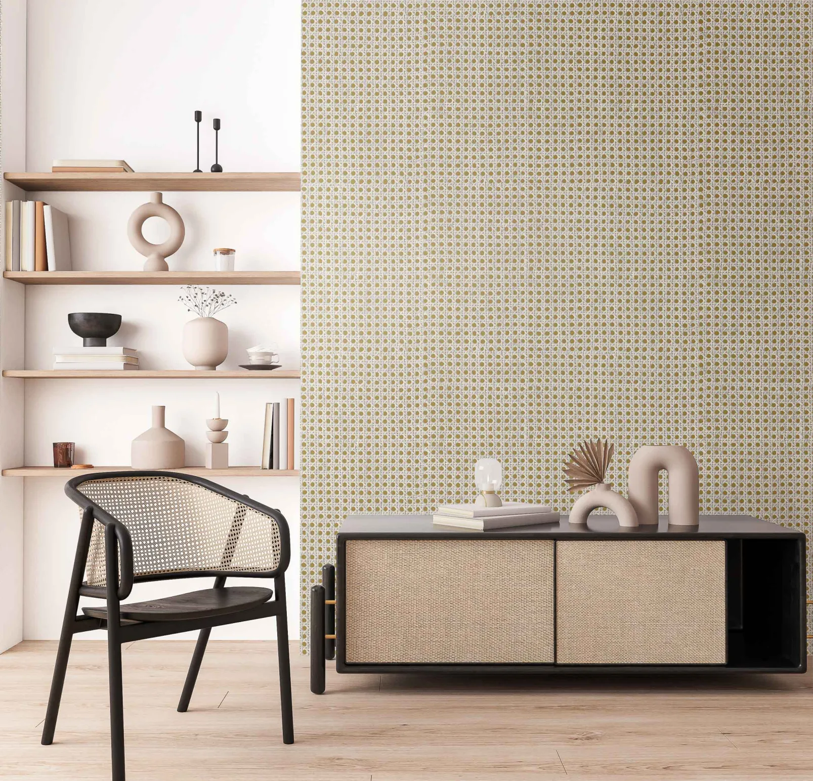El papel pintado de Coordonné es una textura/material diseñada en tonos amarillo/naranja de la colección Raffias+.