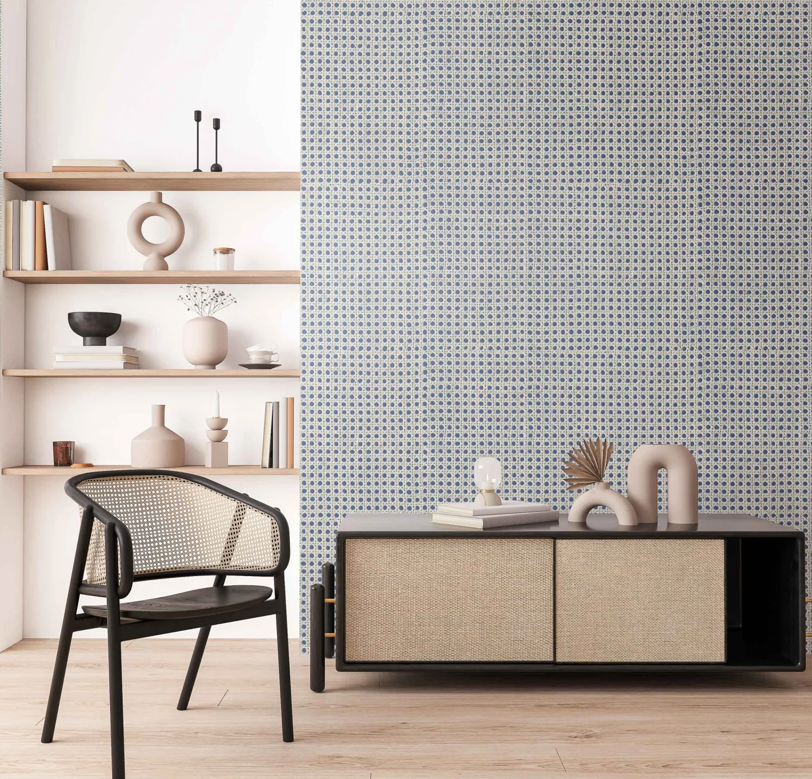El papel pintado de Coordonné es una textura/material diseñada en tonos azules/marinos de la colección Raffias+.
