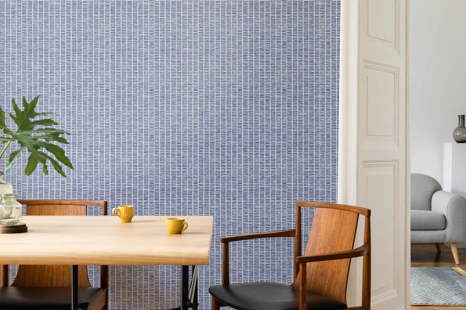 El papel pintado de Coordonné es una textura/material diseñada en tonos azules/marinos de la colección Raffias+.