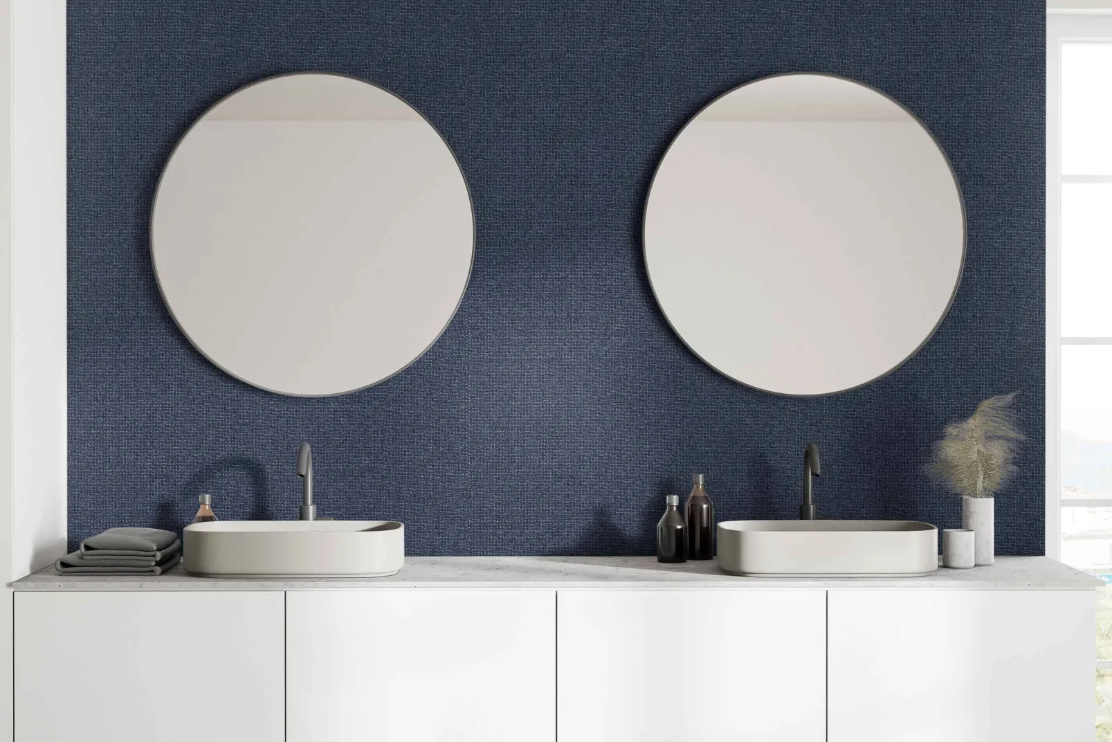 El papel pintado de Coordonné es una textura/material diseñada en tonos azules/marinos de la colección Raffias+.