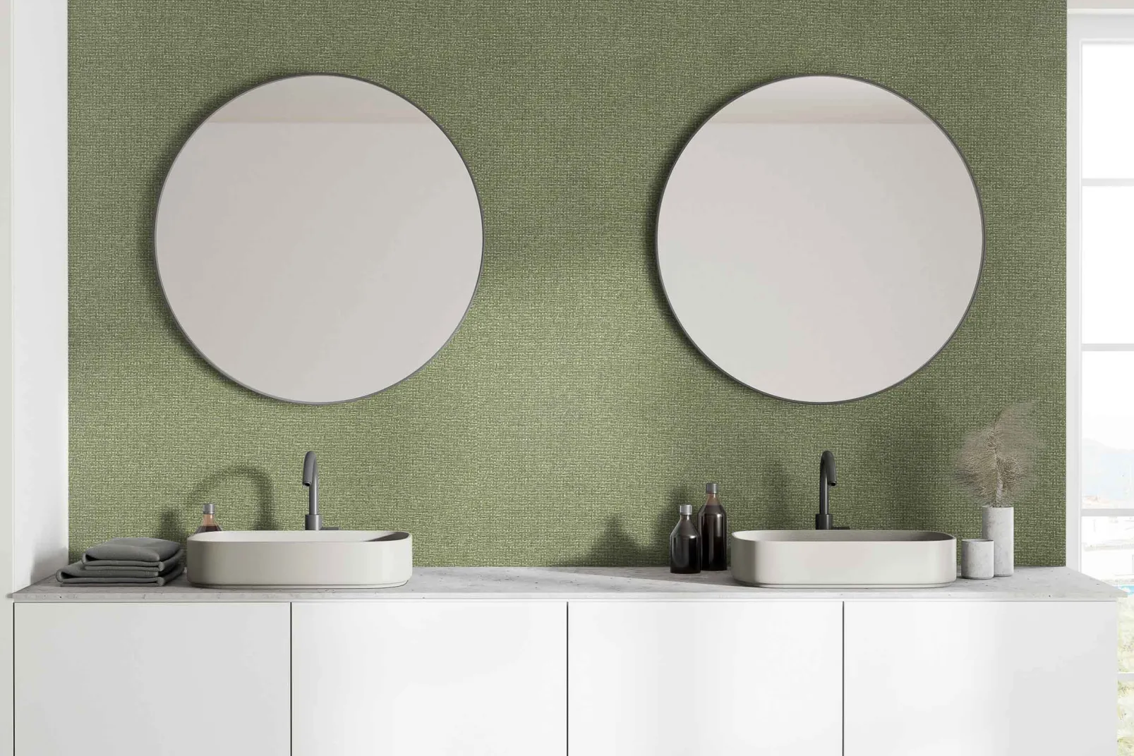 El papel pintado de Coordonné es una textura/material diseñada en tonos verdes de la colección Raffias+.
