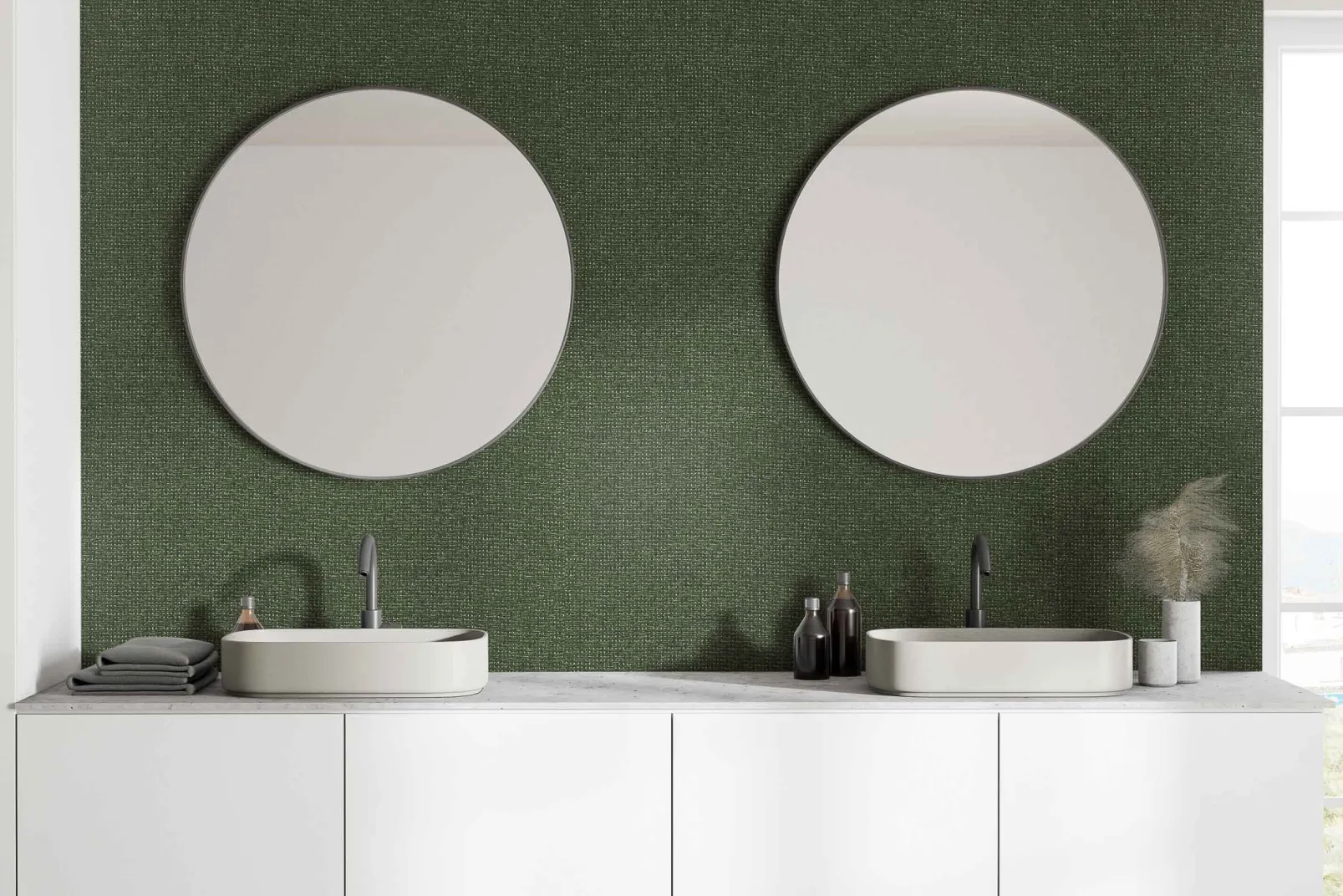El papel pintado de Coordonné es una textura/material diseñada en tonos verdes de la colección Raffias+.