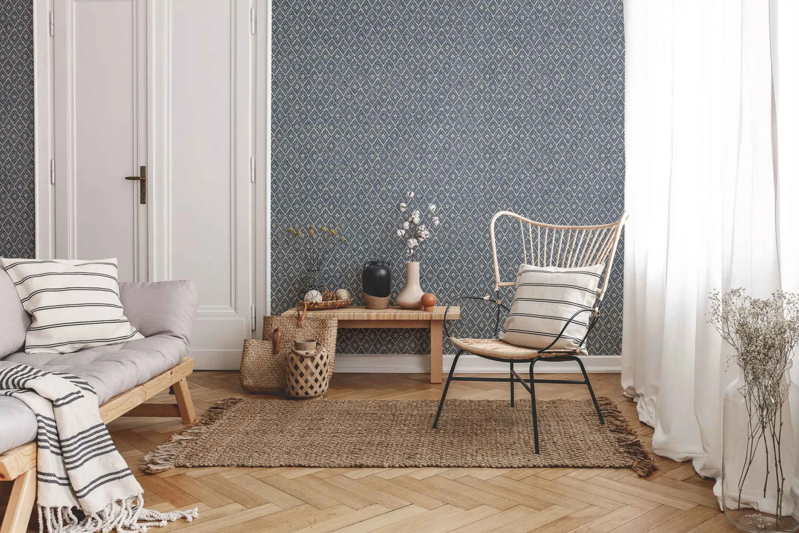 El papel pintado de Coordonné es una textura/material diseñada en tonos azules/marinos de la colección Raffias+.