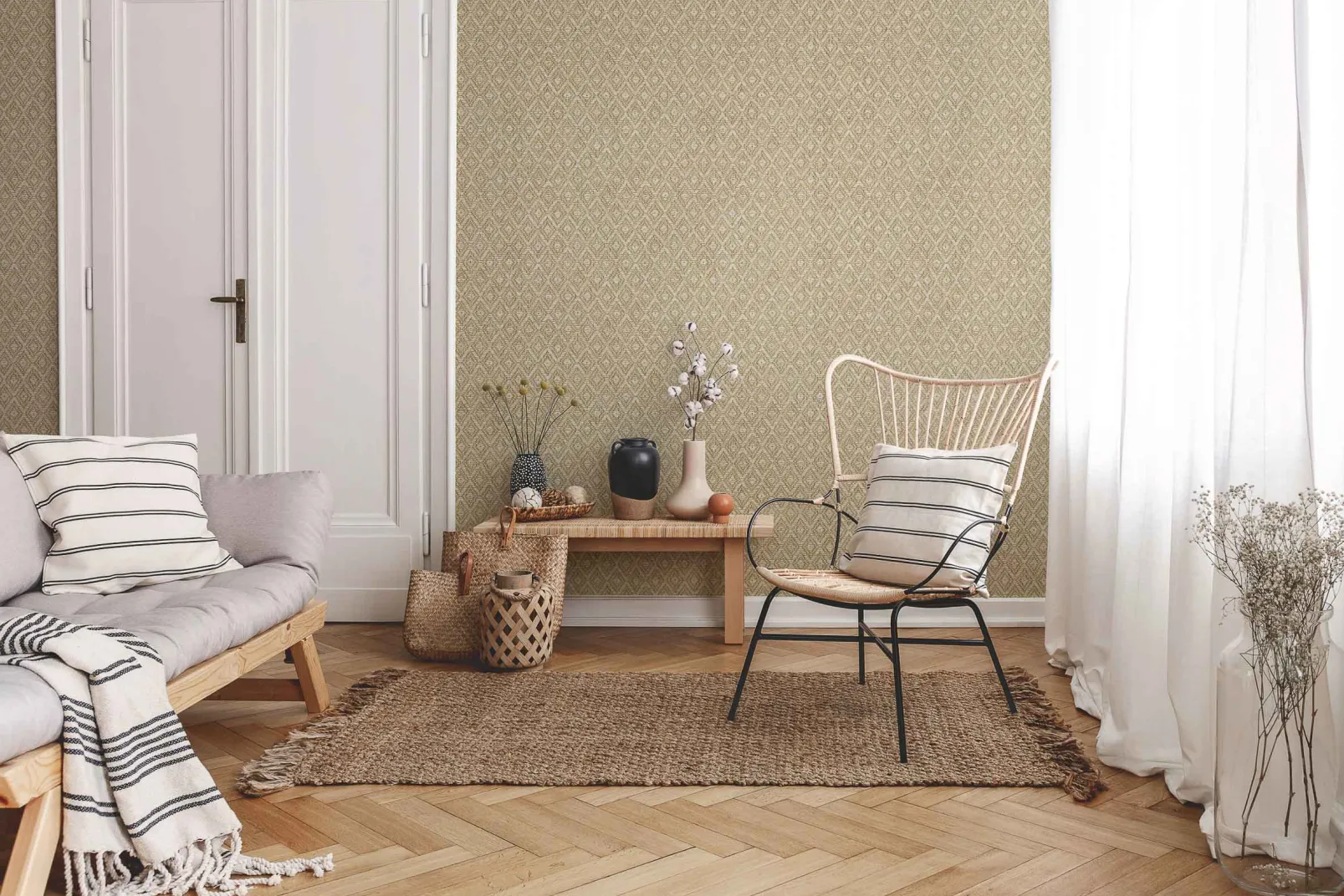 El papel pintado de Coordonné es una textura/material diseñada en tonos Beige/Nude de la colección Raffias+.