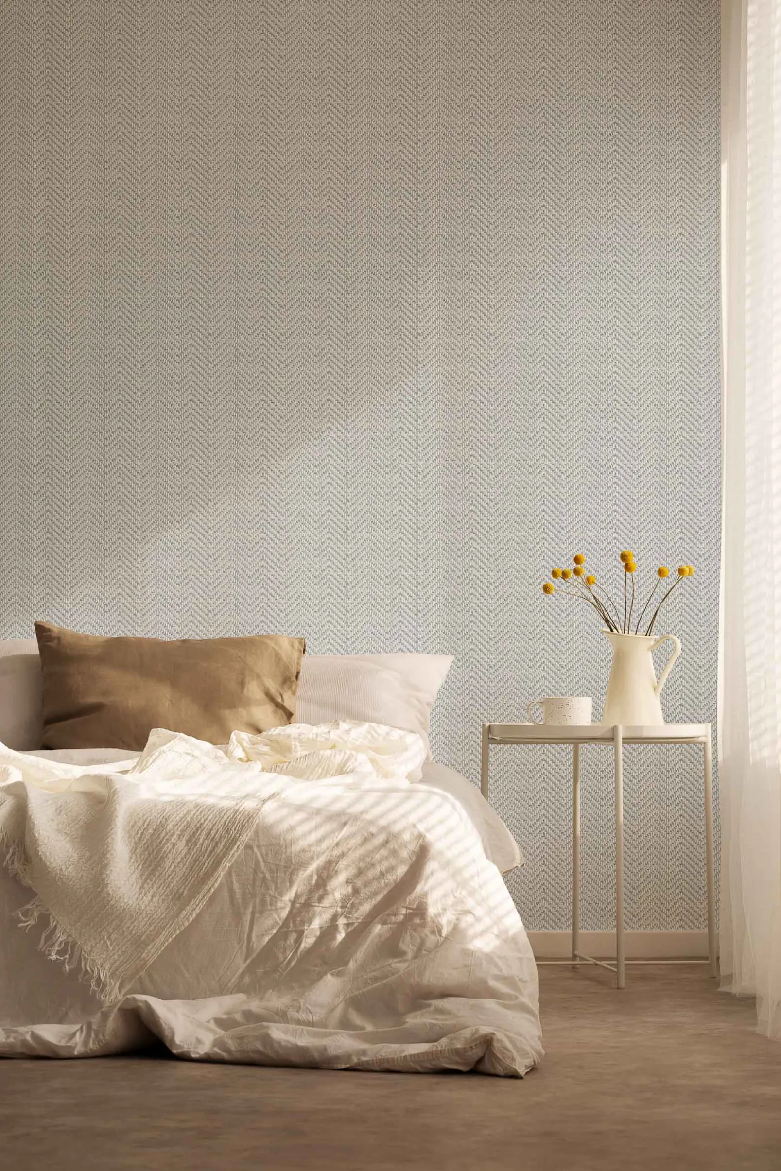 El papel pintado de Coordonné es una textura/material diseñada en tonos blanco/gris de la colección Raffias+.