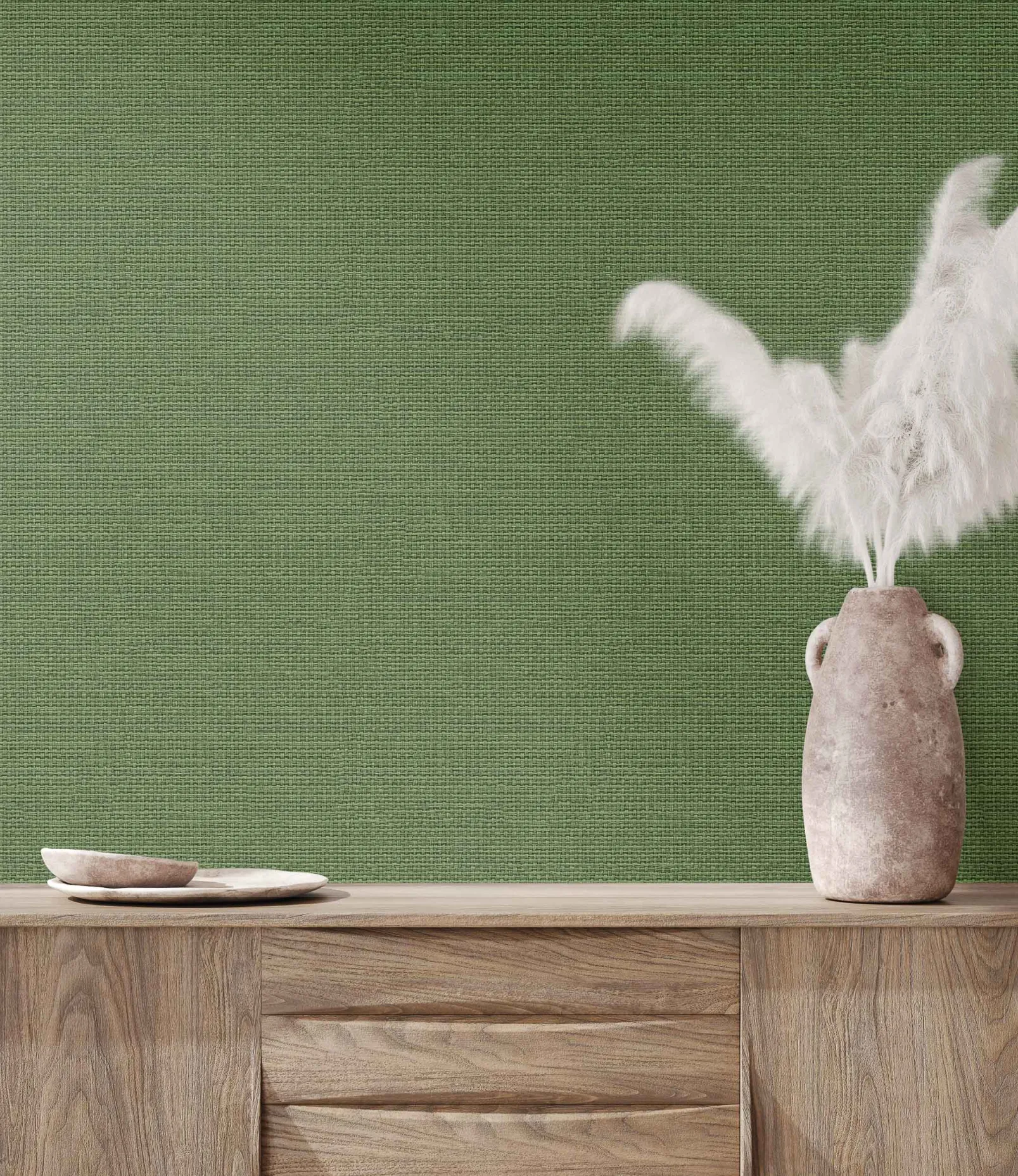 El papel pintado de Coordonné es una textura/material diseñada en tonos verdes de la colección Raffias+.
