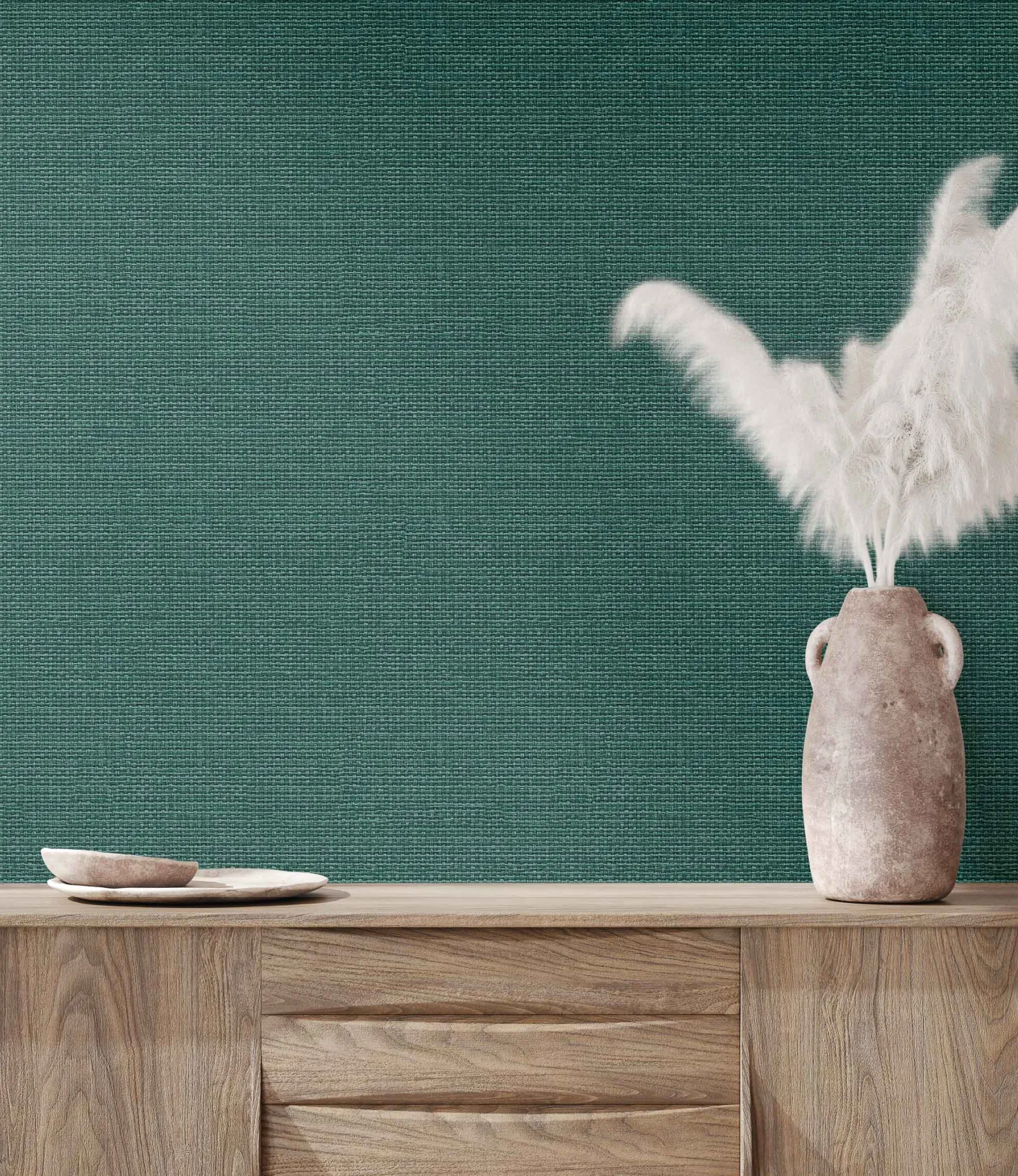 El papel pintado de Coordonné es una textura/material diseñada en tonos verdes de la colección Raffias+.