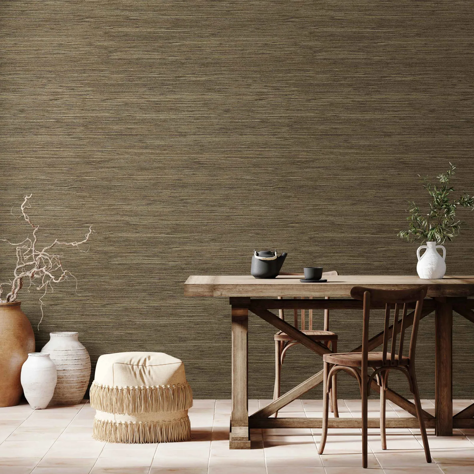 El papel pintado de Coordonné es una textura/material diseñada en tonos marrones de la colección Raffias+.