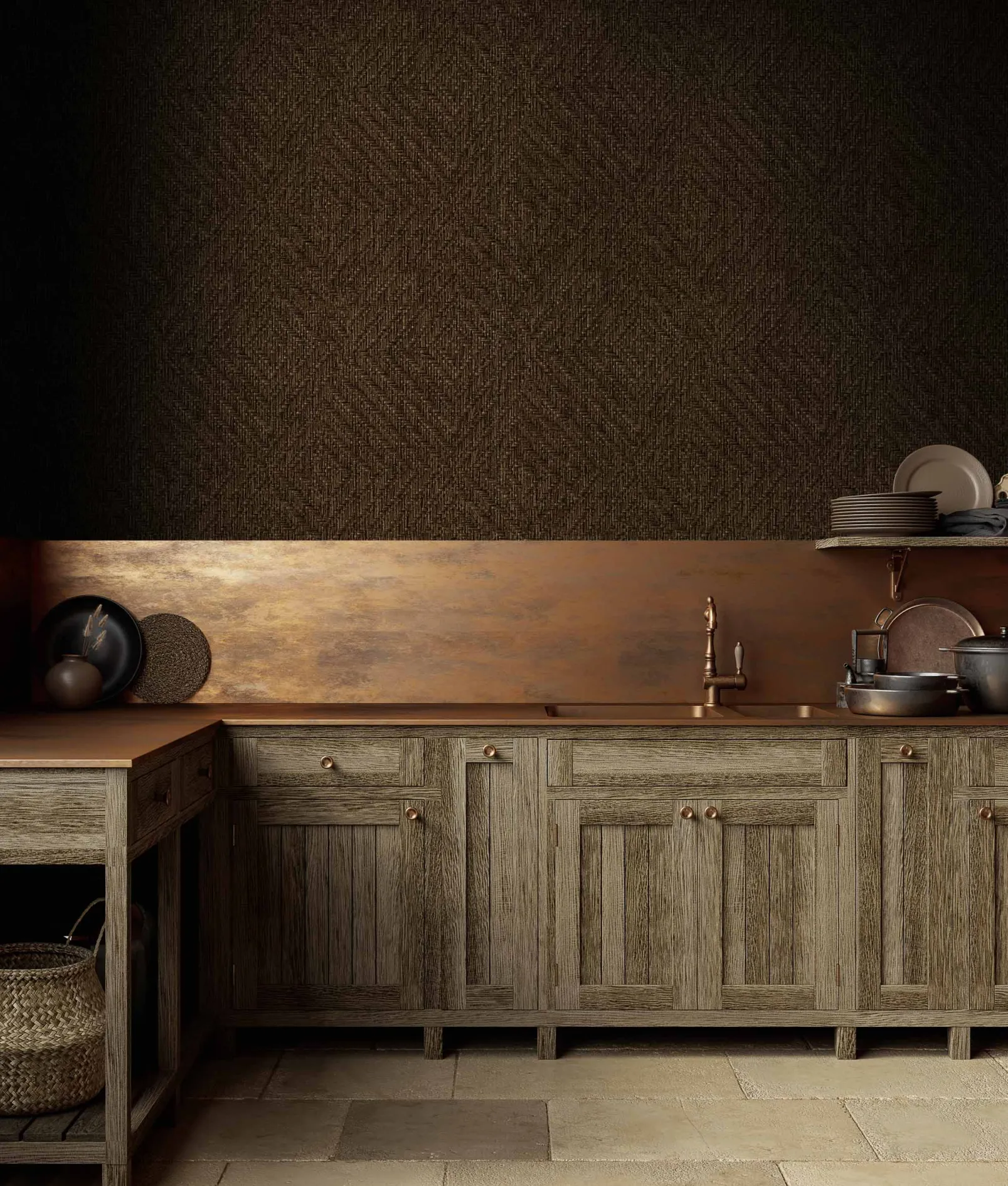 El papel pintado de Coordonné es una textura/material diseñada en tonos marrones de la colección Raffias+.