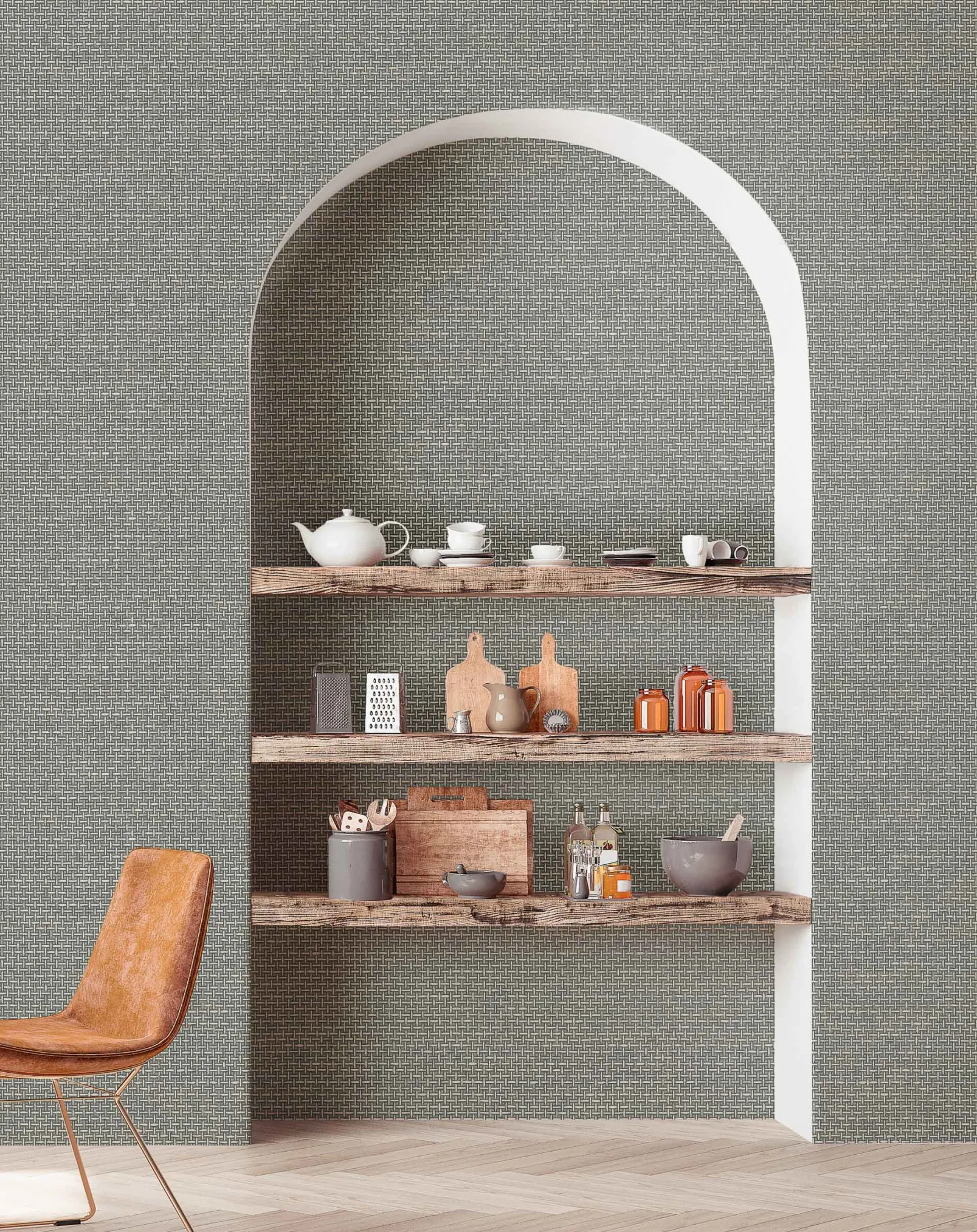 El papel pintado de Coordonné es una textura/material diseñada en tonos blanco/gris de la colección Raffias+.
