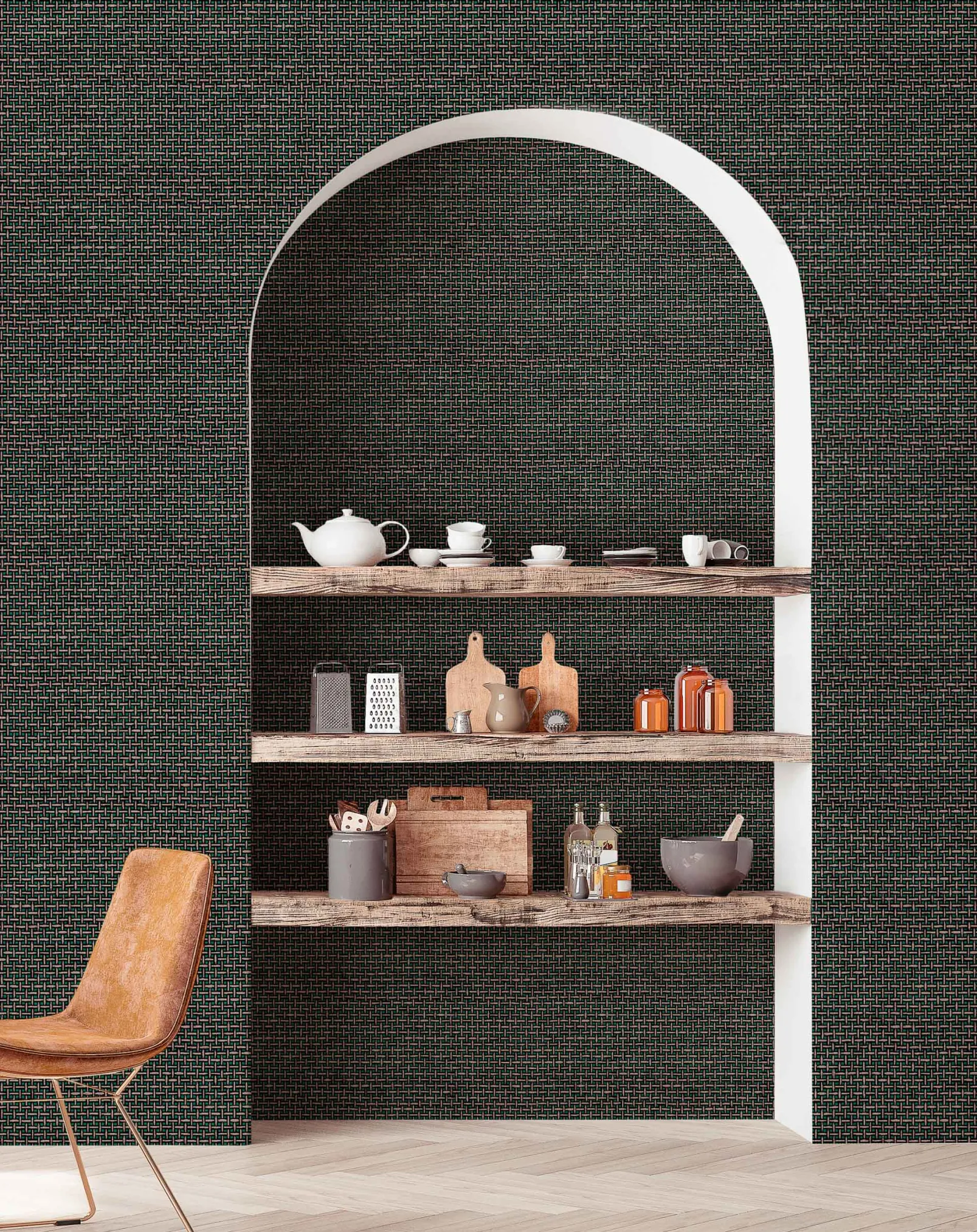 El papel pintado de Coordonné es una textura/material diseñada en tonos verdes de la colección Raffias+.