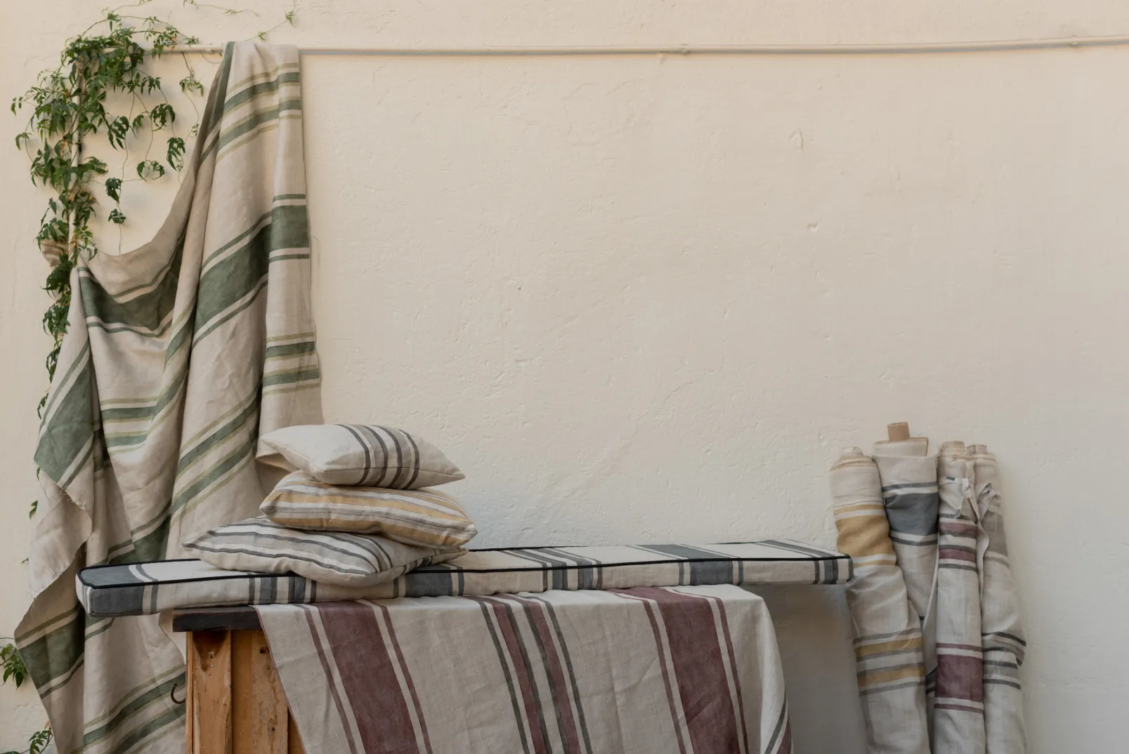 El tejido Afri-Line Adobe de Coordonné es un diseño de rayas en rojo/vino de la colección Maasai.
