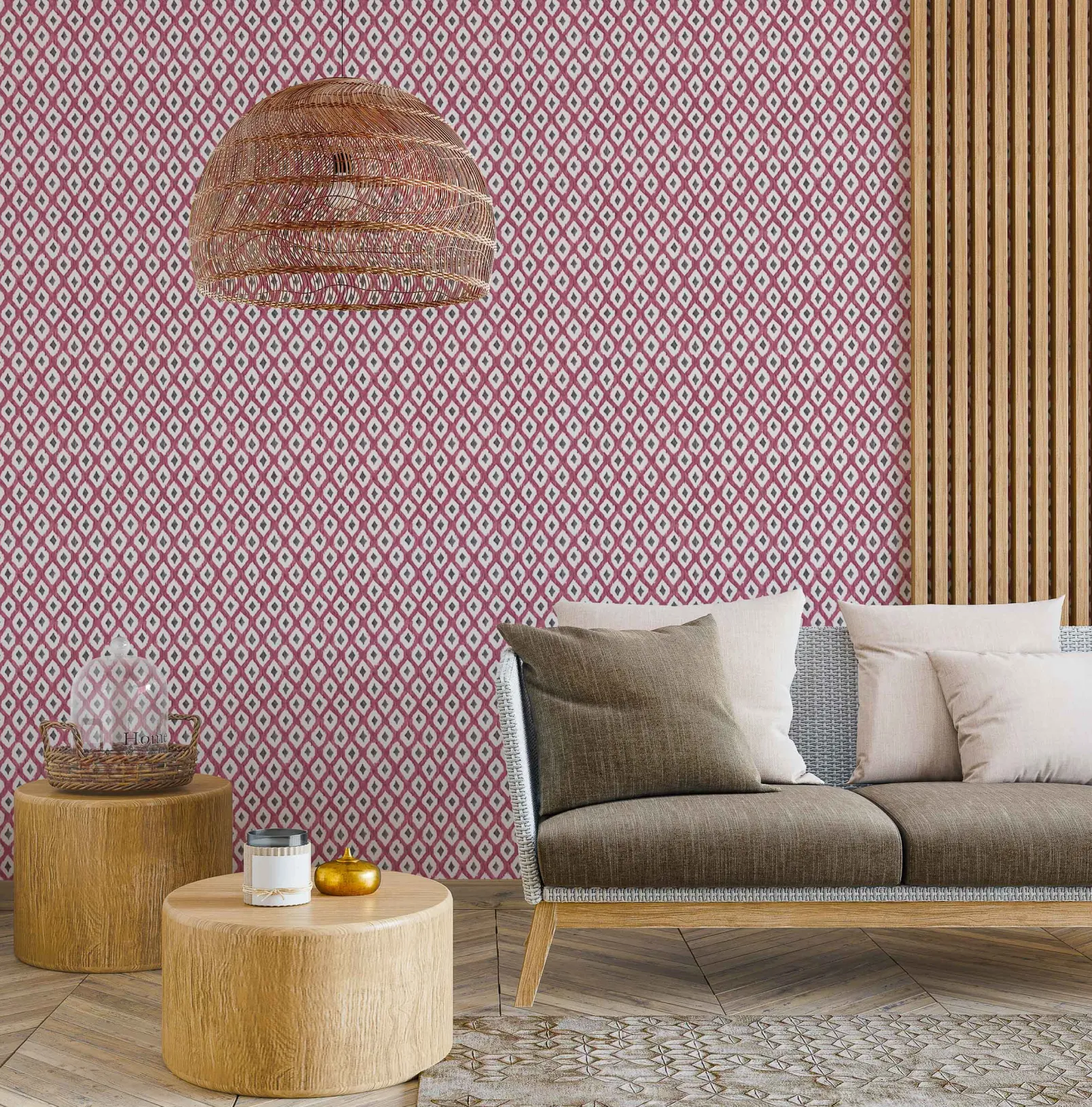 El papel pintado Animal Print Cereza de Coordonné es un diseño geométrico en tonos rojo/vino de la colección Indiano.