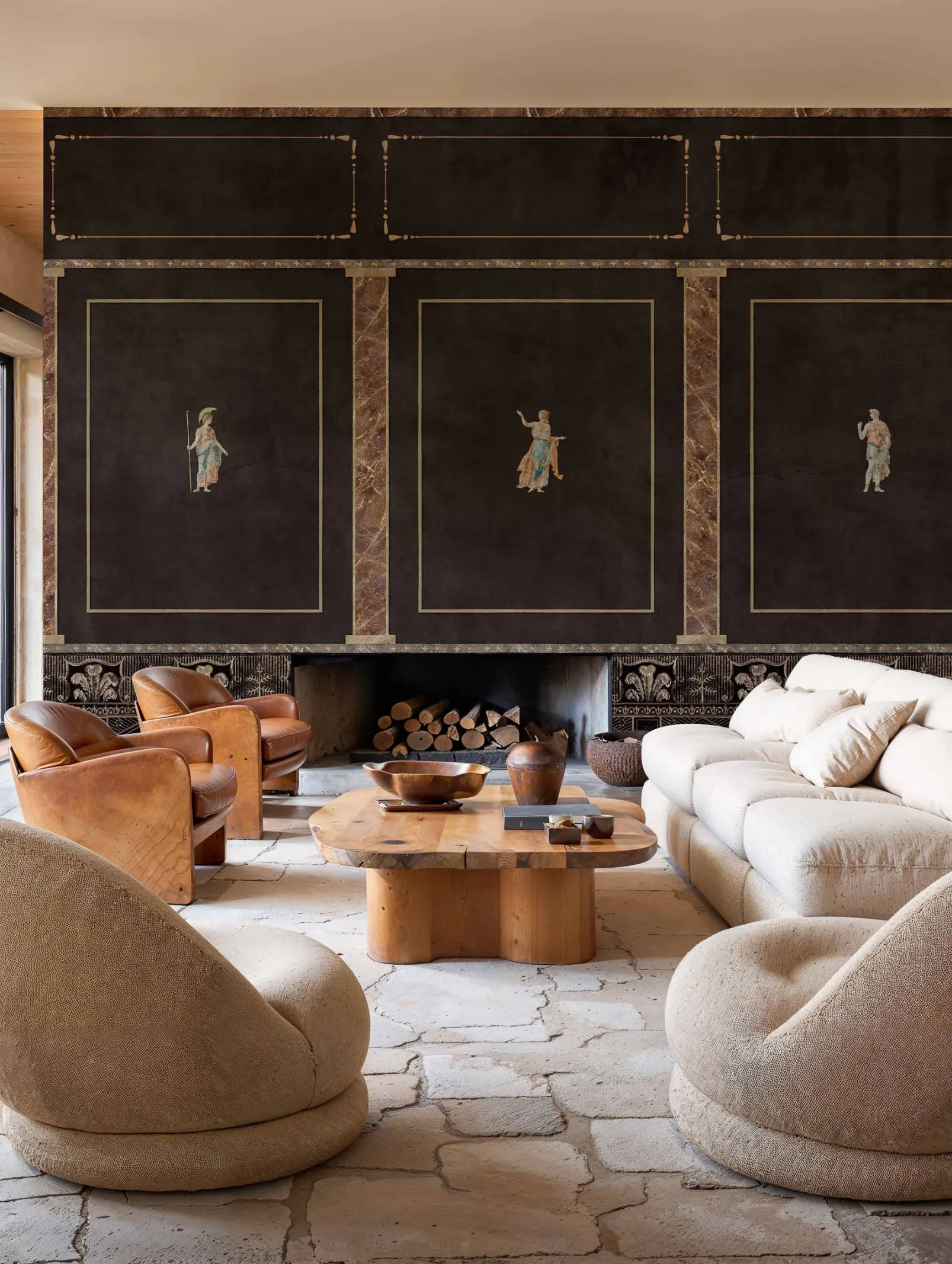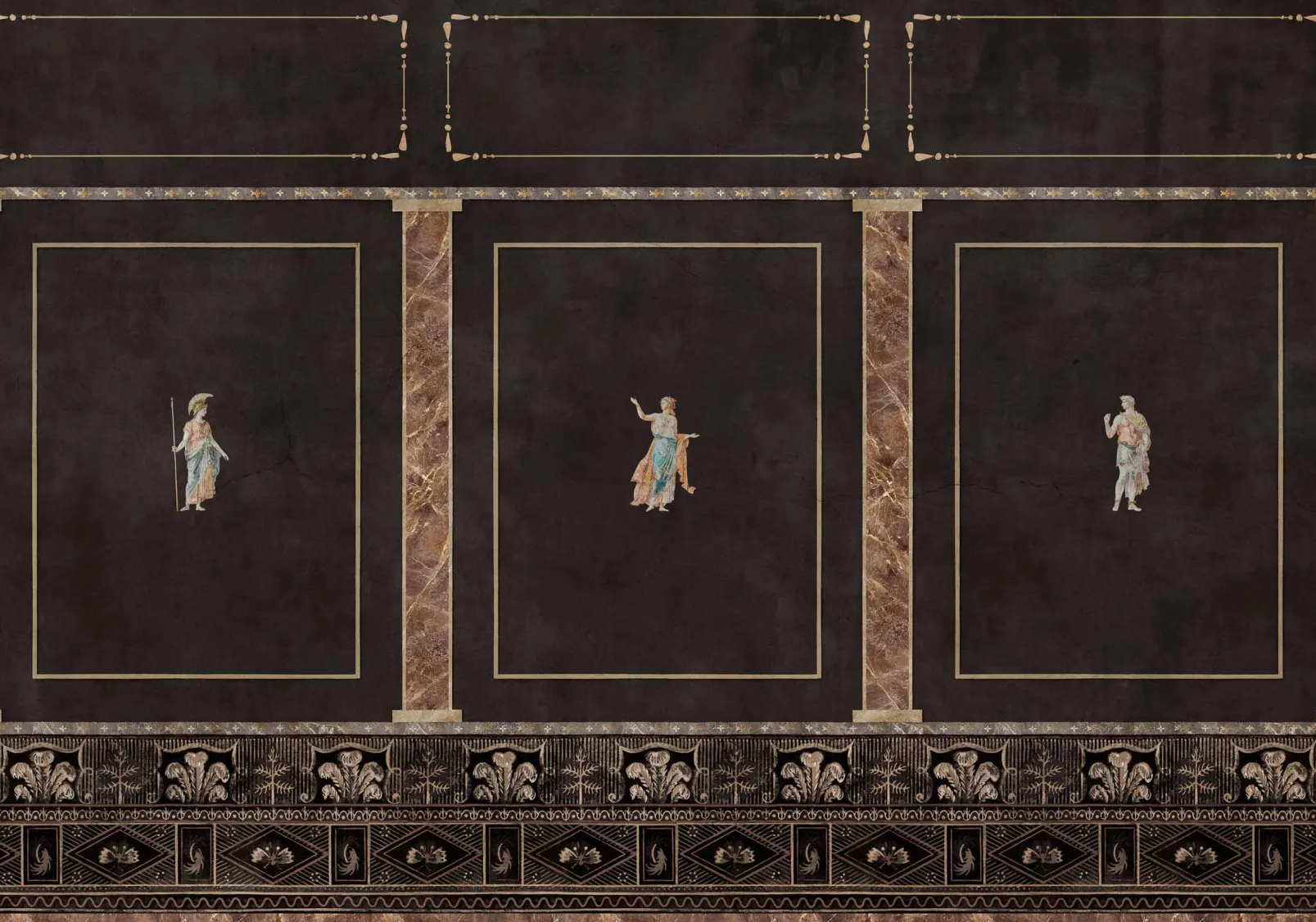 El carbón Arianna de Coordonné es un diseño de arquitectura en negro de la colección Pompei. Vibrante decoración de frescos que alternan frontones geométricos y molduras lineales.