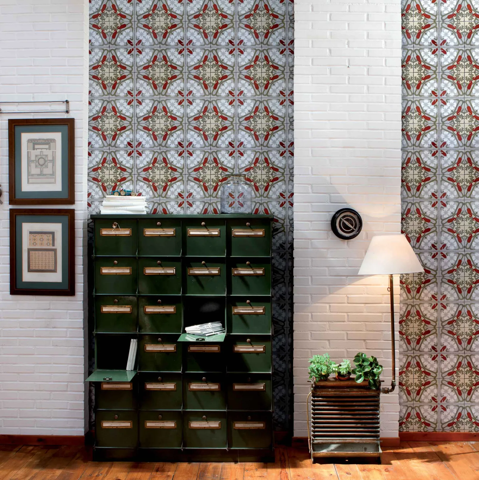 El papel pintado Art Decó de Coordonné es un Geométrico diseñado en tonos Rojo/Vino de la colección Tiles.