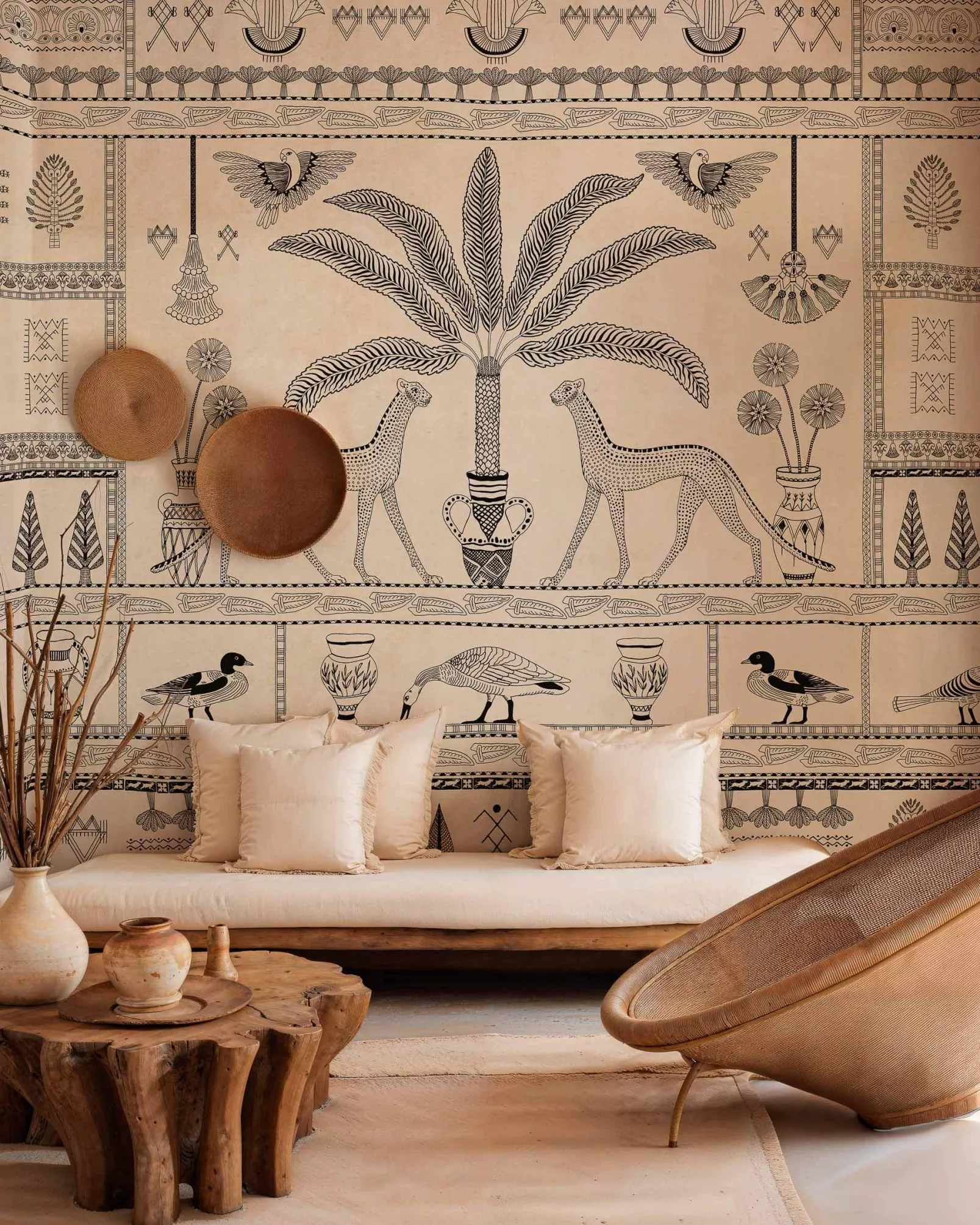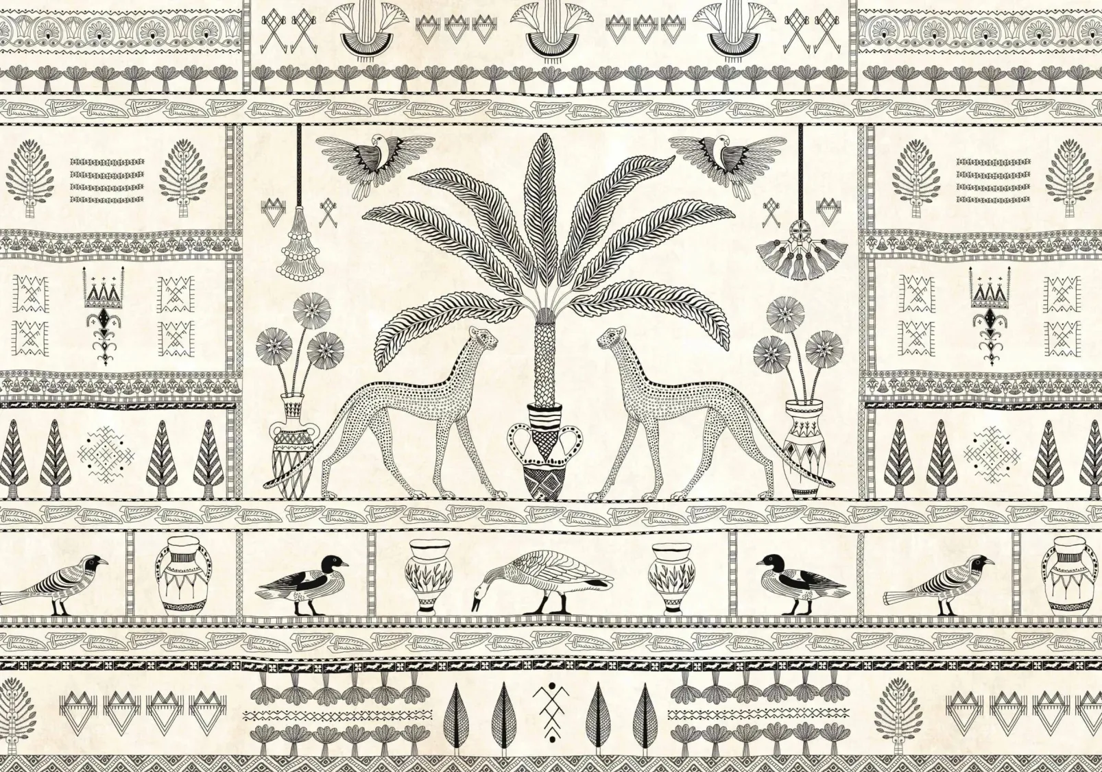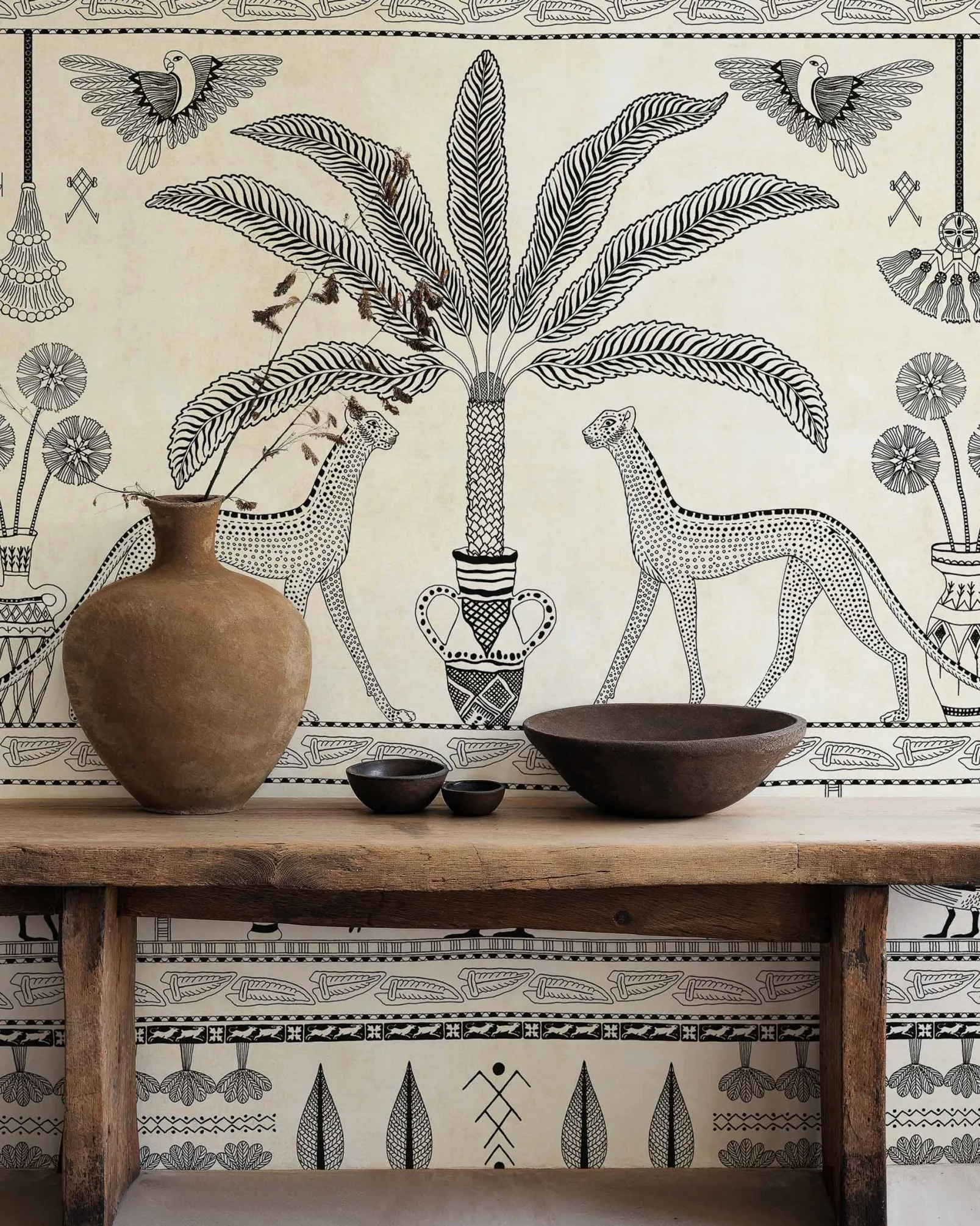 Asni Valley Cotton de Coordonne es un papel pintado de inspiración animal en tonos blanco/gris de la colección Bereber. Animales icónicos entrelazados entre la naturaleza y motivos ornamentales.