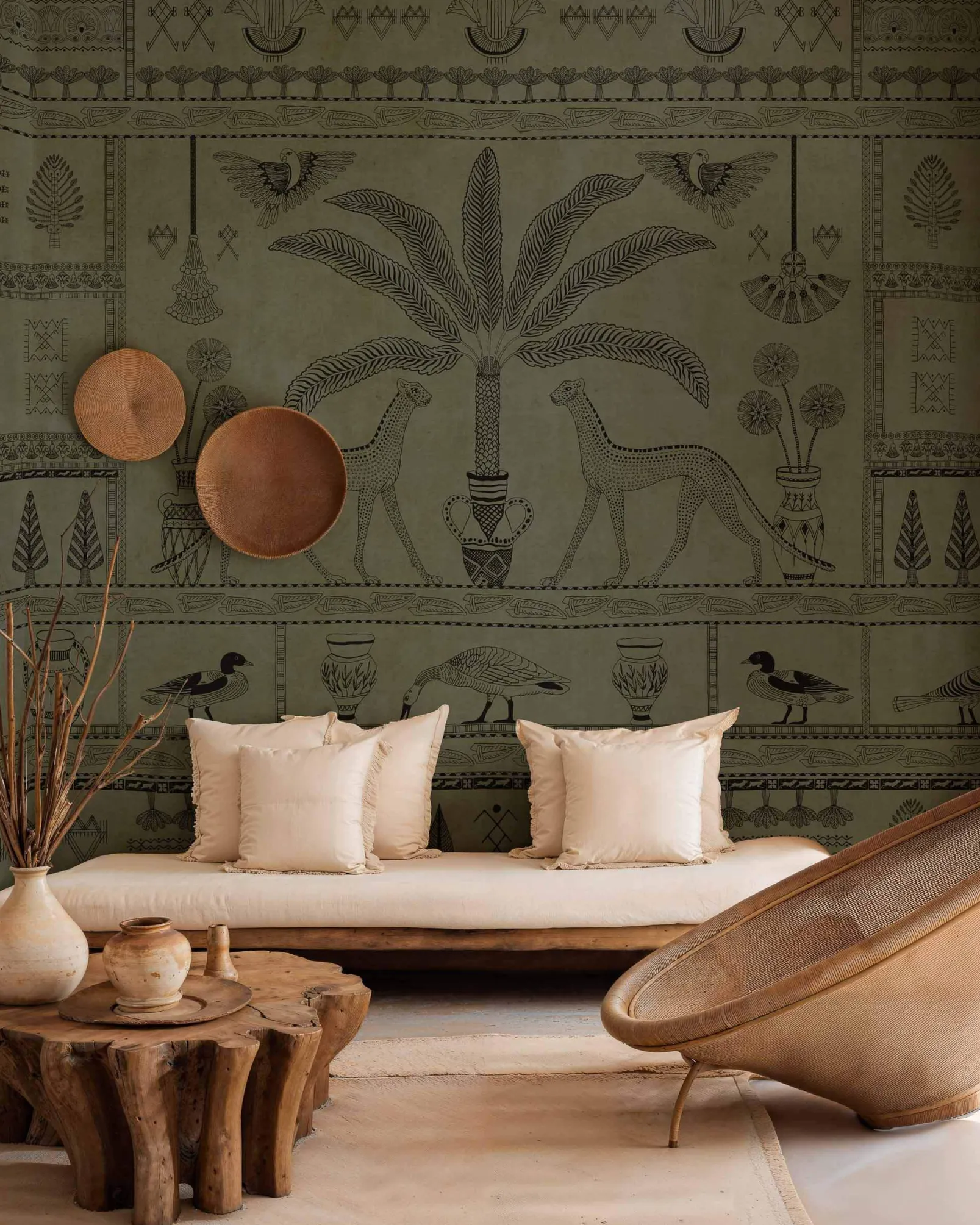 Asni Valley Leaves de Coordonne es un papel pintado de inspiración animal en tonos verdes de la colección Berber. Animales icónicos entrelazados entre la naturaleza y motivos ornamentales.