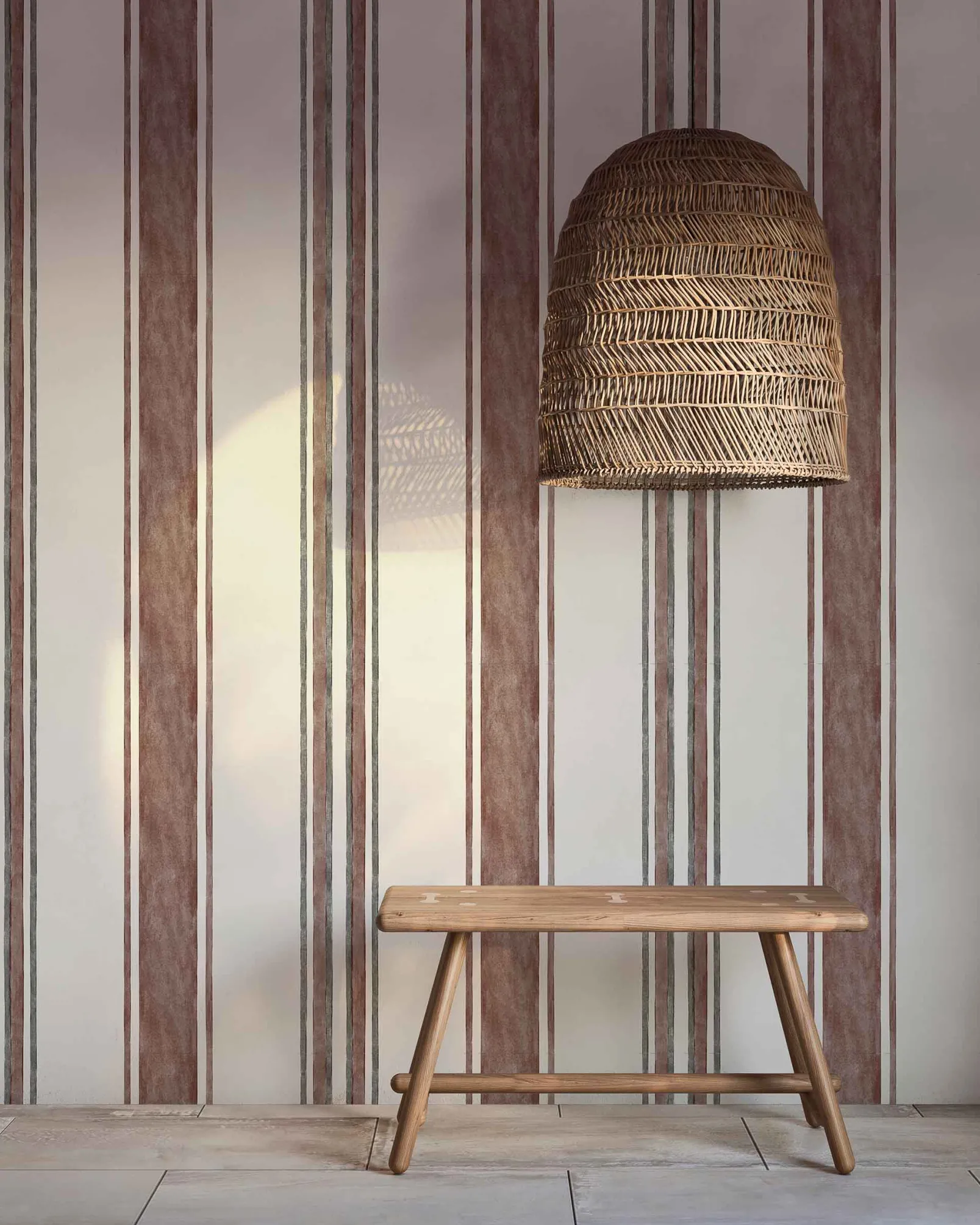 El papel pintado Baobab Adobe de Coordonné es un diseño de rayas en tonos amarillo/naranja de la colección Maasai.
