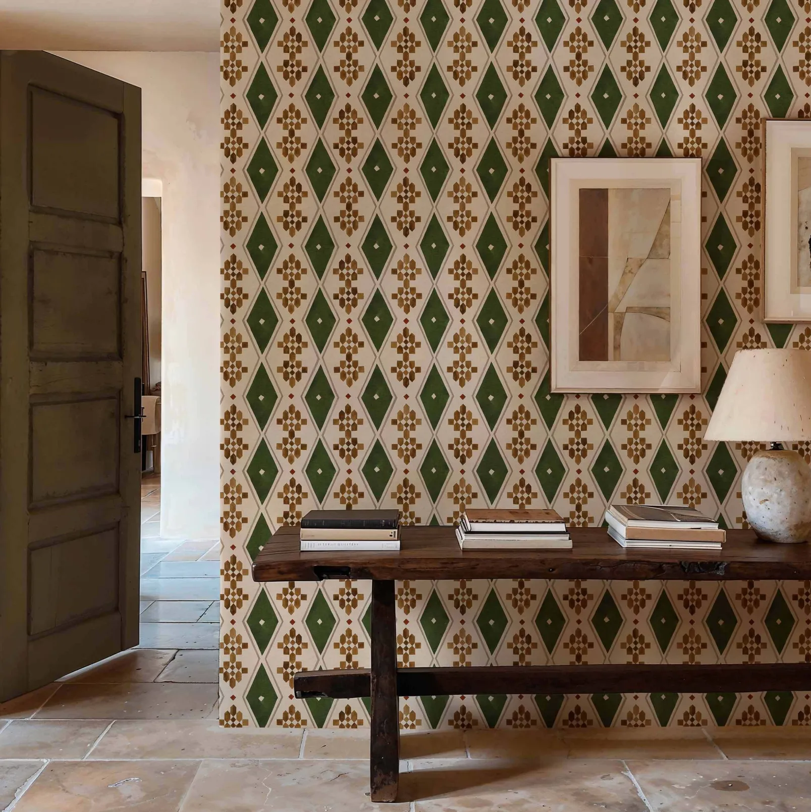 Beldi Rugs Leaves de Coordonne es un papel pintado inspirado en la textura en tonos verdes de la colección Berber. Homenaje a las alfombras que cubrían las habitaciones y los desfiles de Yves Saint Laurent.