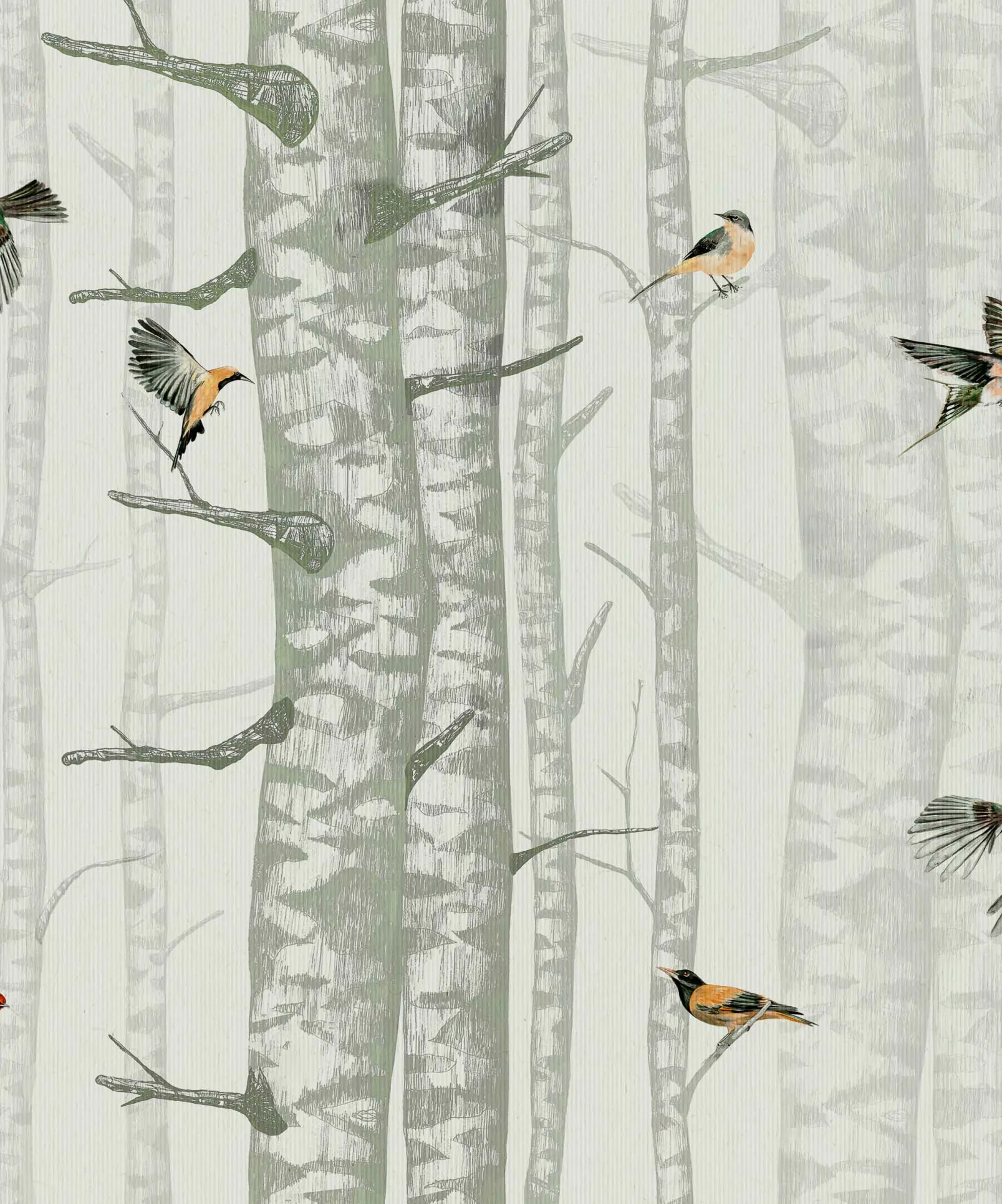 El papel pintado Birch Trees Silvester de Coordonné es un paisaje diseñado en tonos verdes de la colección Naturae.
