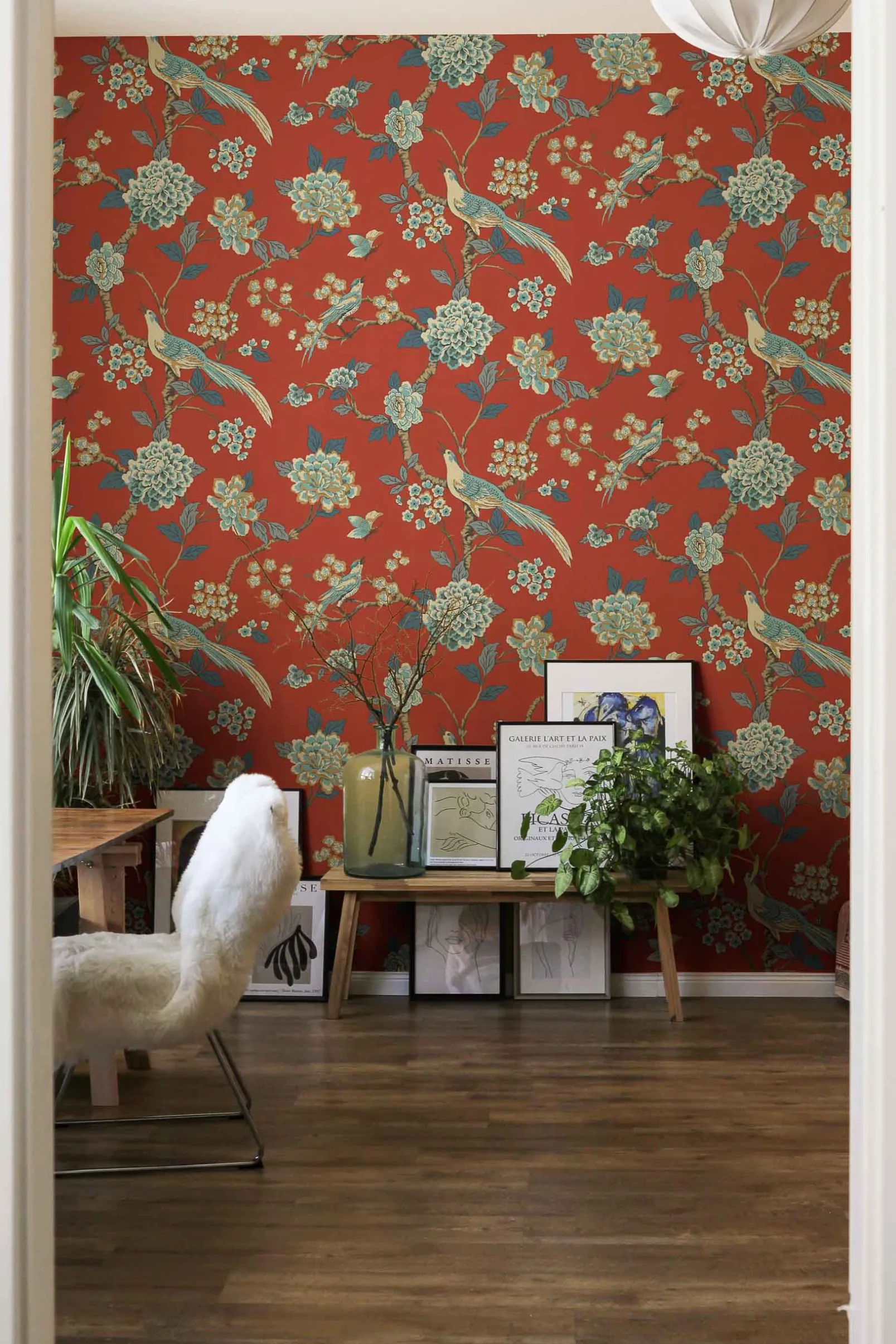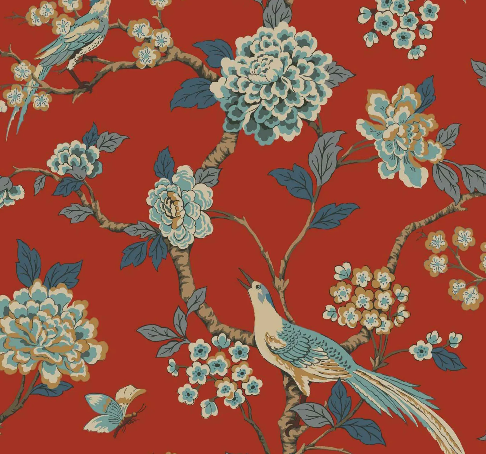 El papel pintado Bird Song Coral de Coordonné es un diseño floral en tonos rojo/vino de la colección Enchanted.