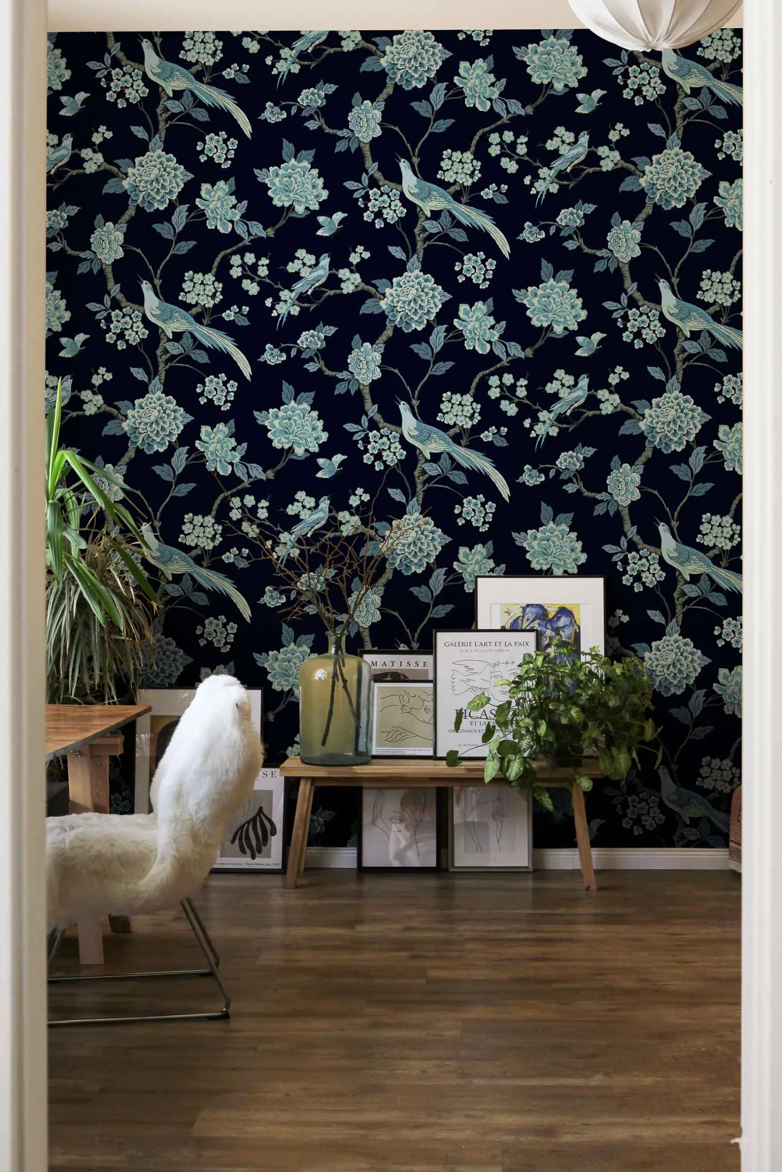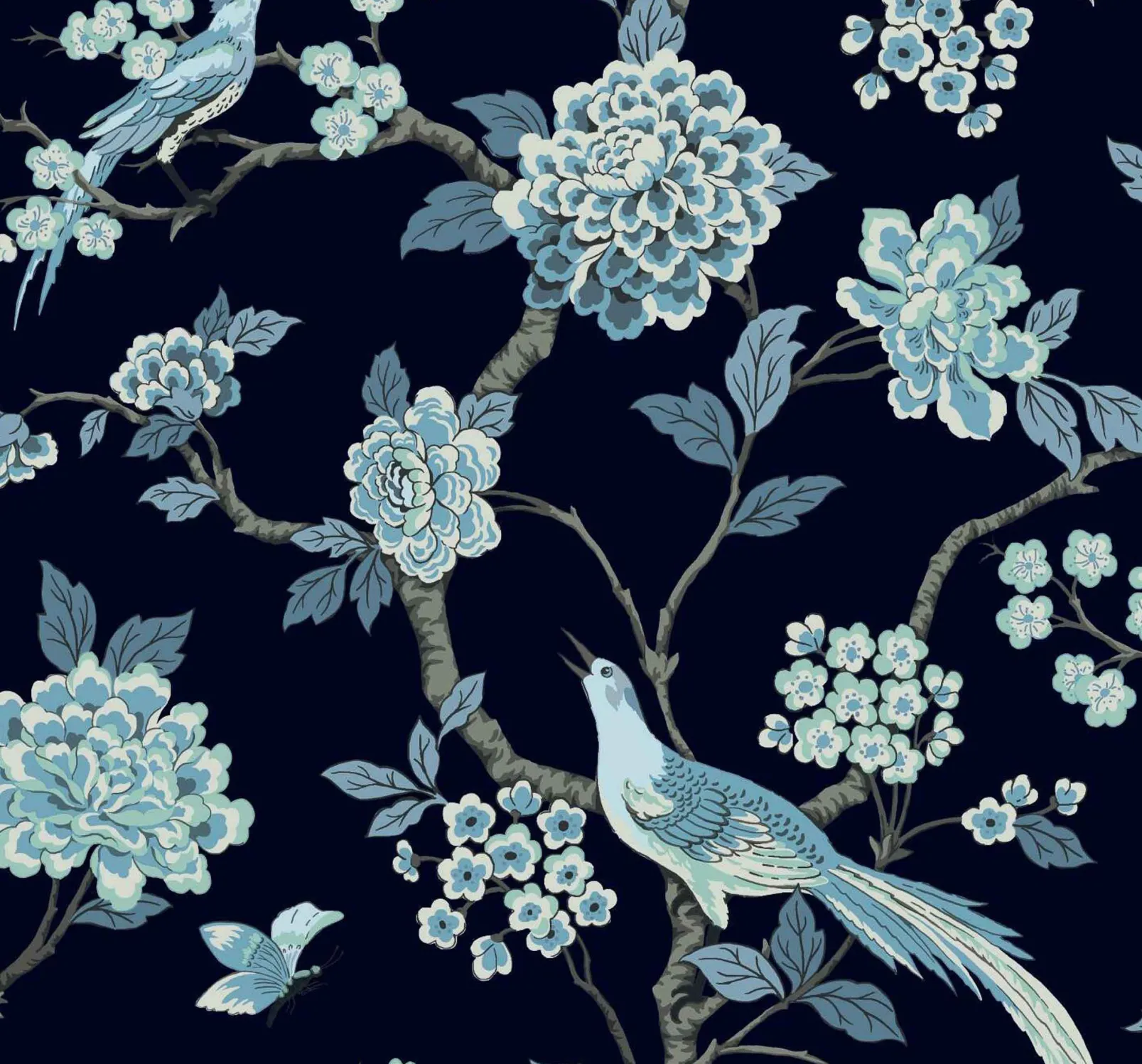 El papel pintado Bird Song Navy de Coordonné es un diseño floral en tonos azules/azules de la colección Enchanted.