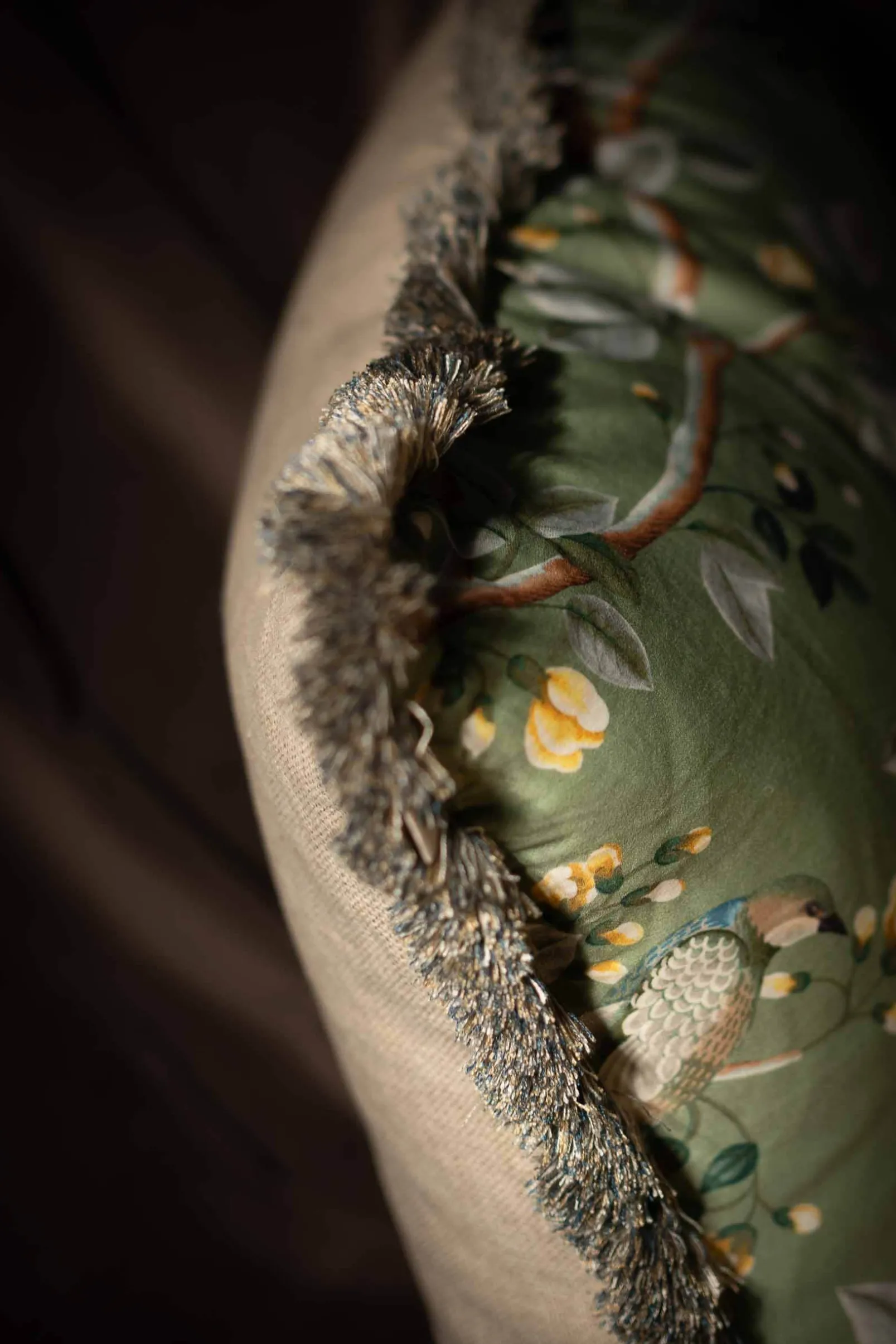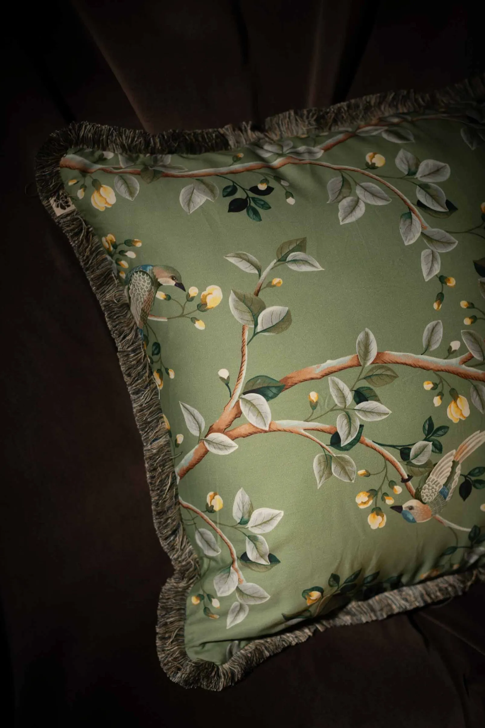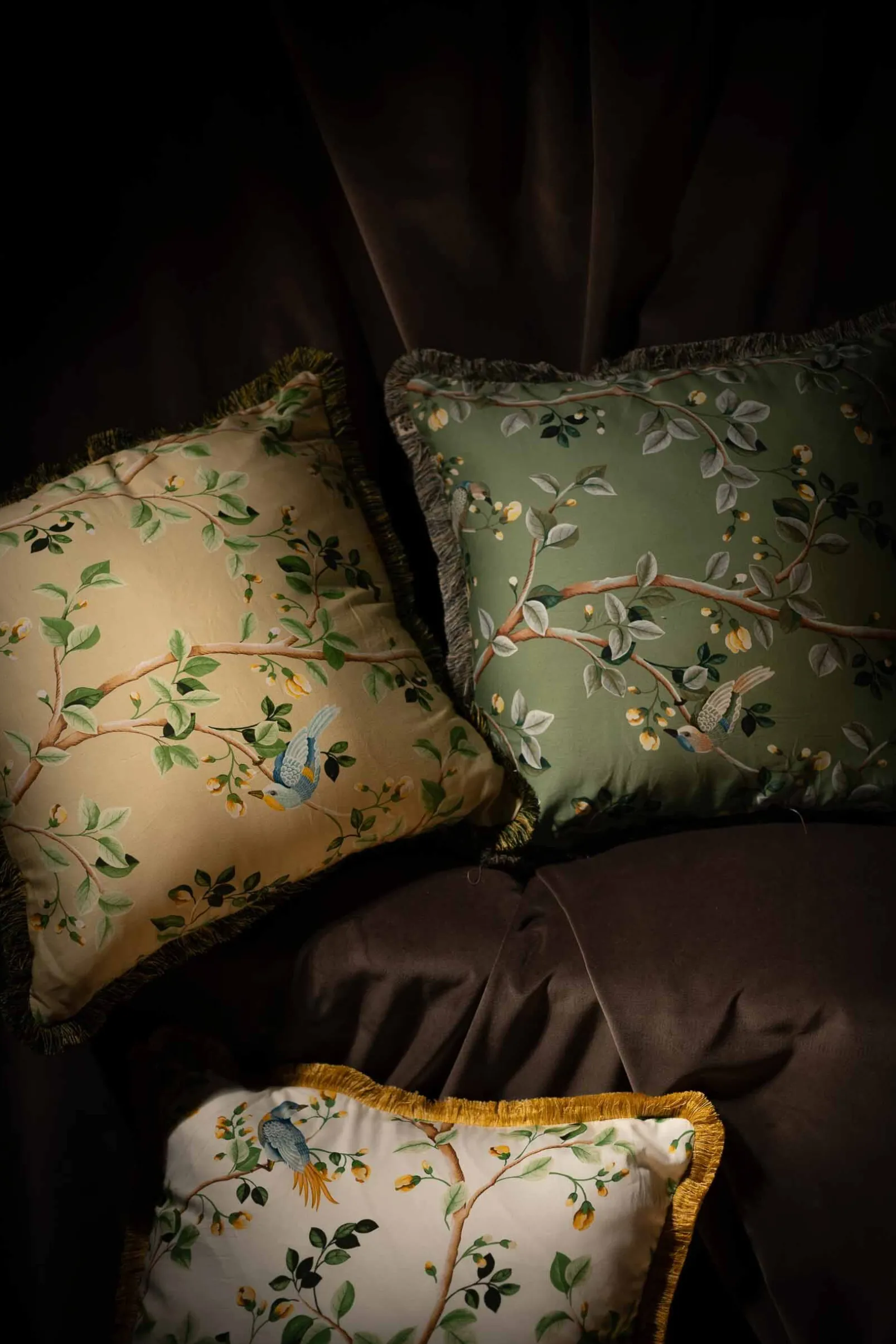 Coordonné’s Birds Prosperity Jade es un diseño de inspiración floral en verde de la colección Forbidden City. Reverso en lino liso de tono neutro.