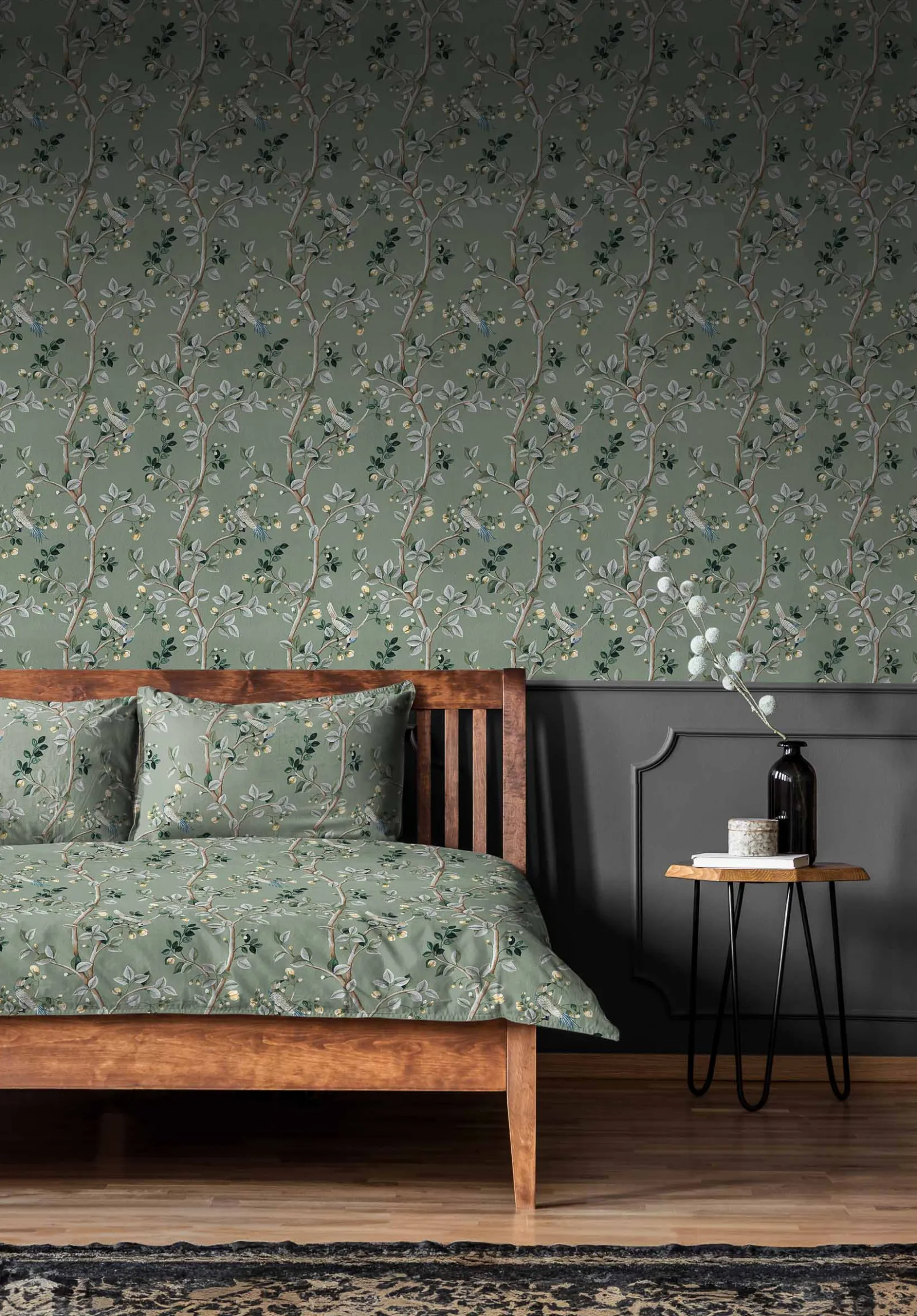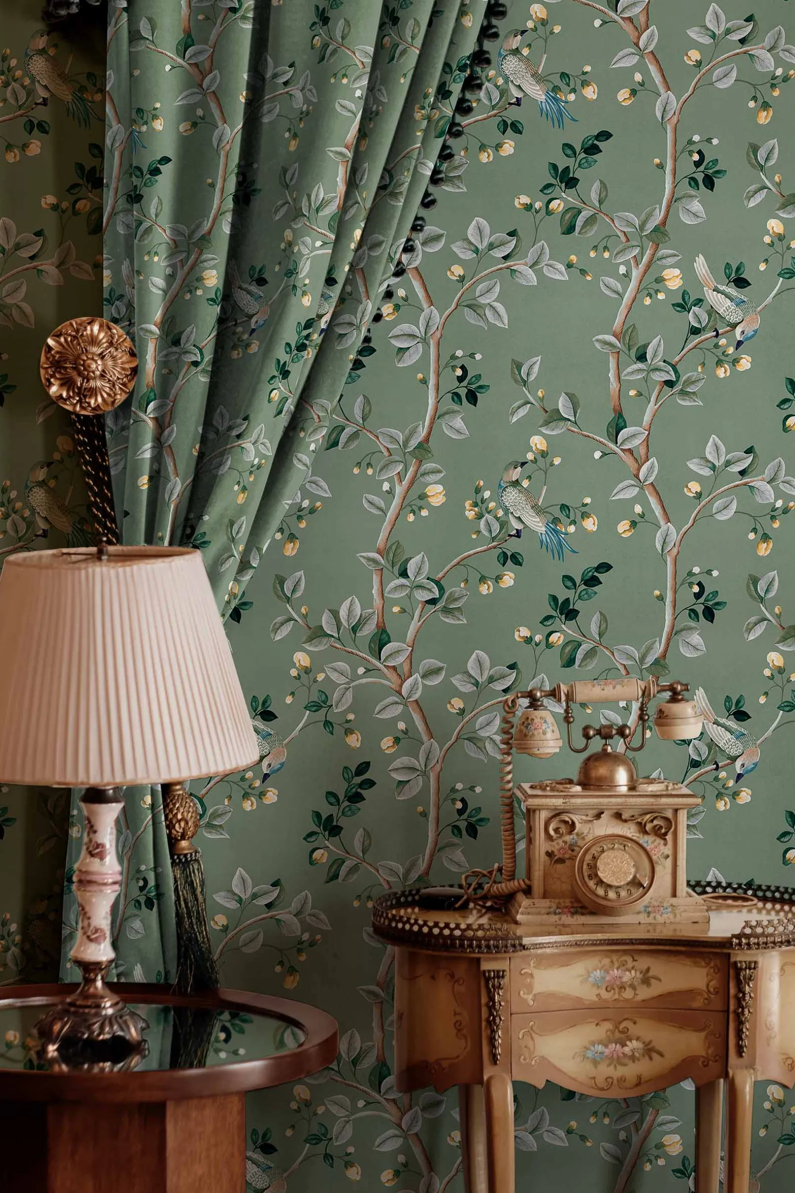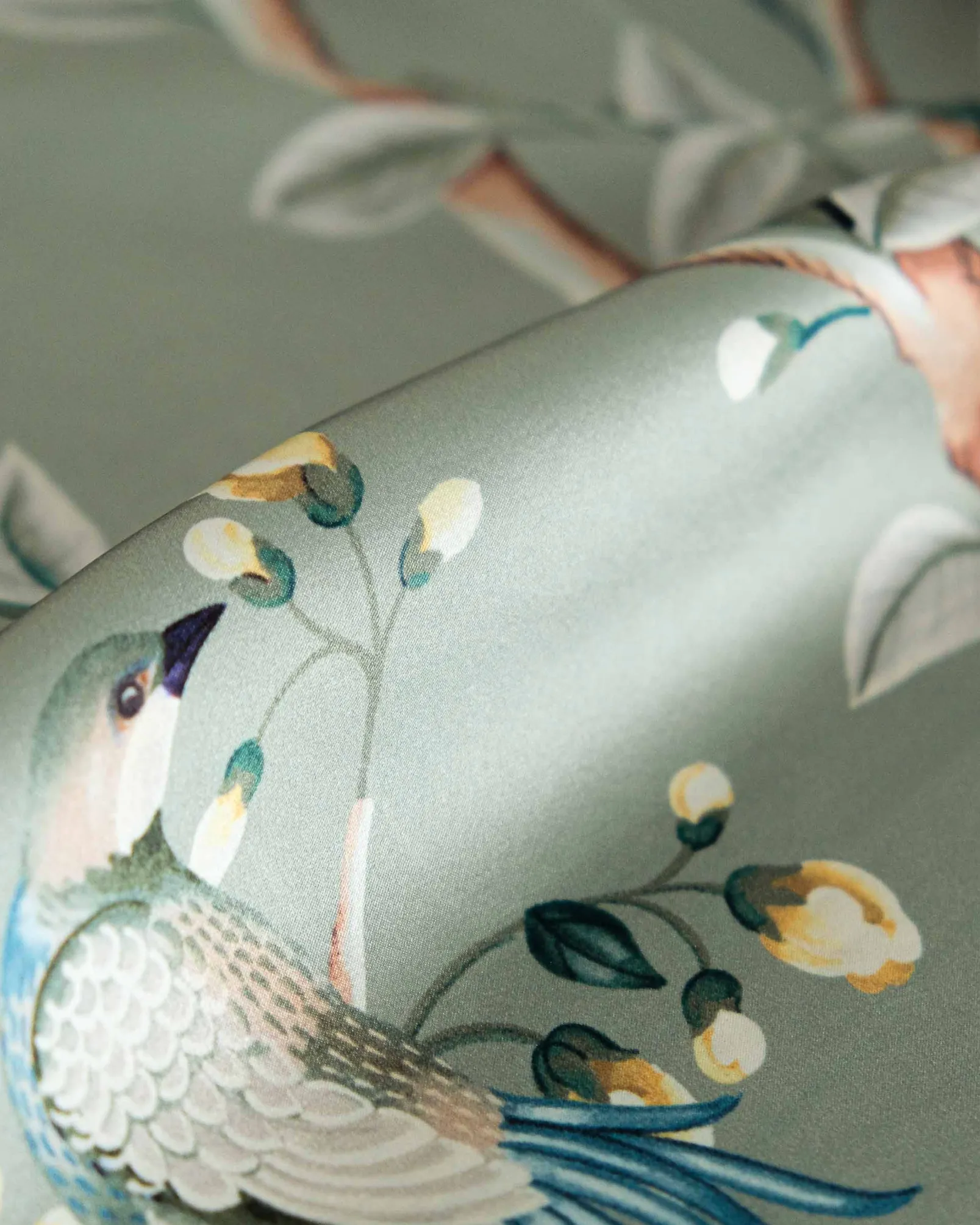 La tela Birds Prosperity Jade de Coordonné es un diseño de animales en turquesa/blanco de la colección Forbidden City Fabrics.