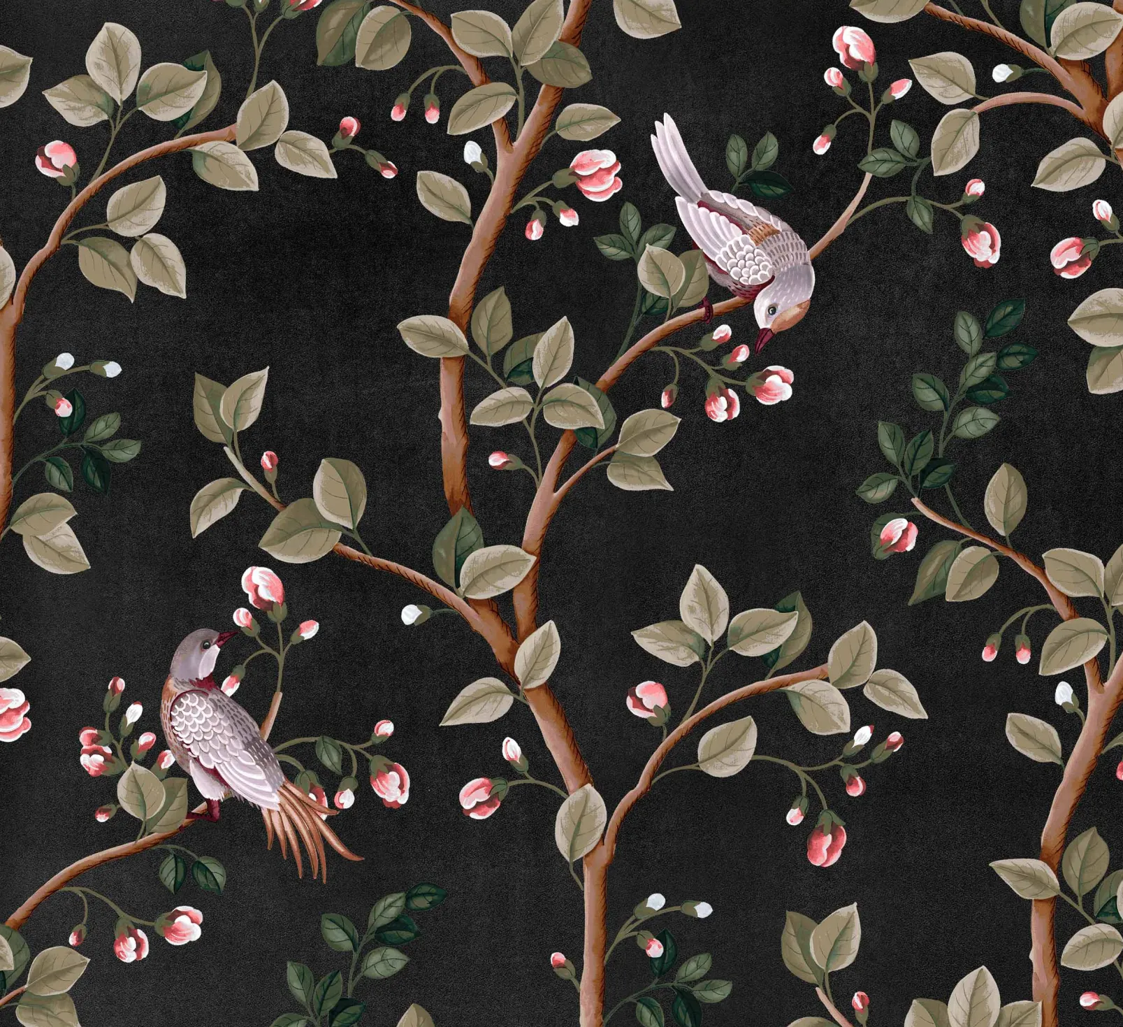 Coordonné’s Birds Prosperity Onyx es un papel pintado negro. El plumaje que adorna los extravagantes banquetes imperiales
