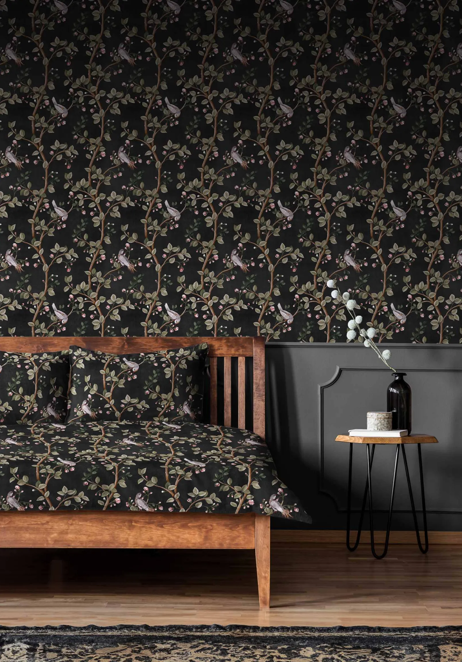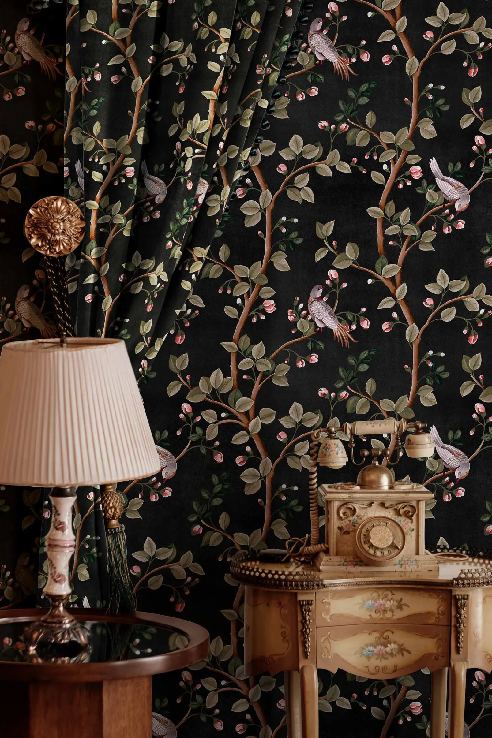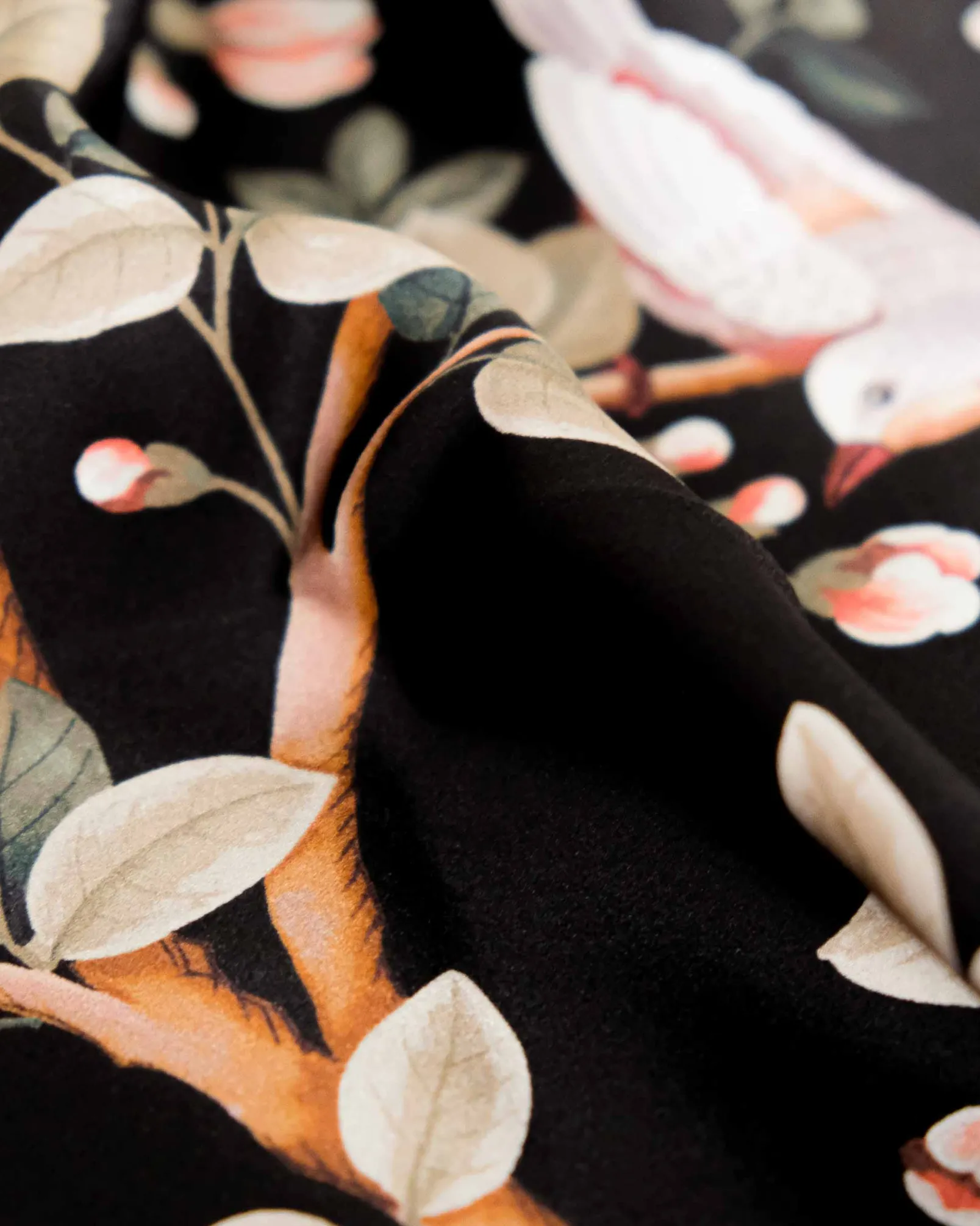 La tela Birds Prosperity Onyx de Coordonné es un diseño de animales en blanco/negro de la colección Forbidden City Fabrics.