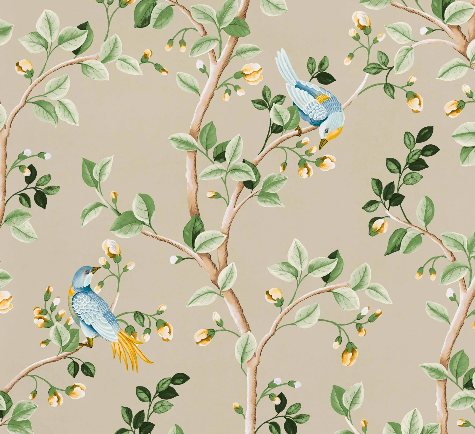 El Papiro Prosperidad de los Pájaros de Coordonné es un papel pintado beige/nude . Plumaje que adorna extravagantes fiestas imperiales