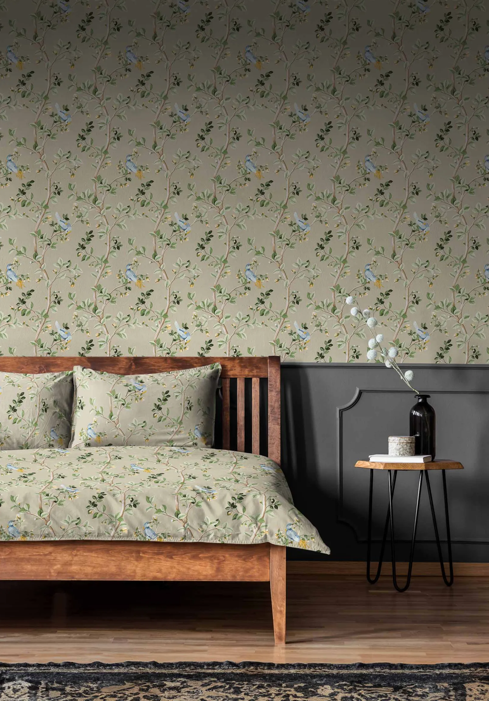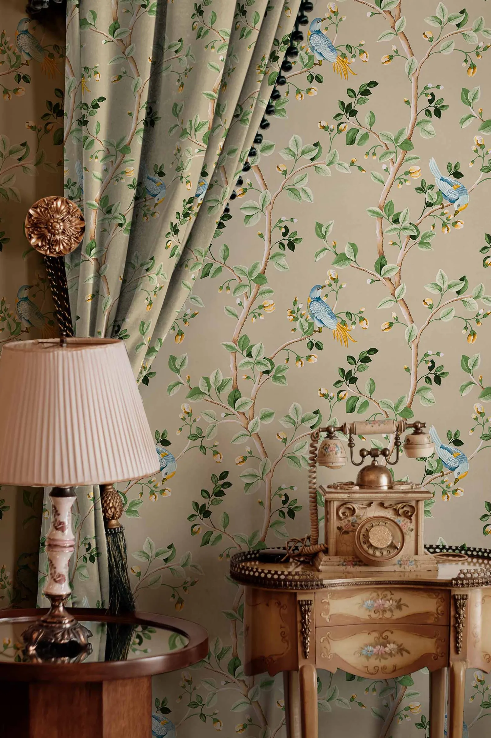 La tela Birds Prosperity Papyrus de Coordonné es un diseño de animales en beige/azul de la colección Forbidden City Fabrics.