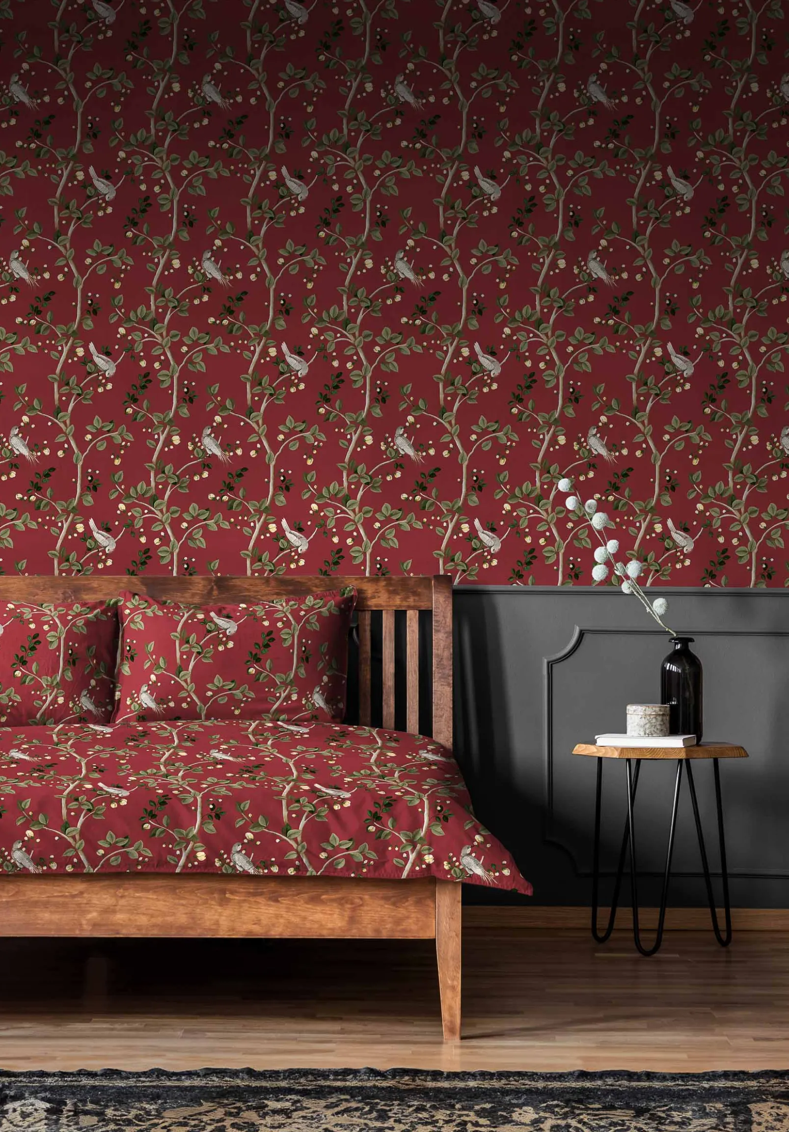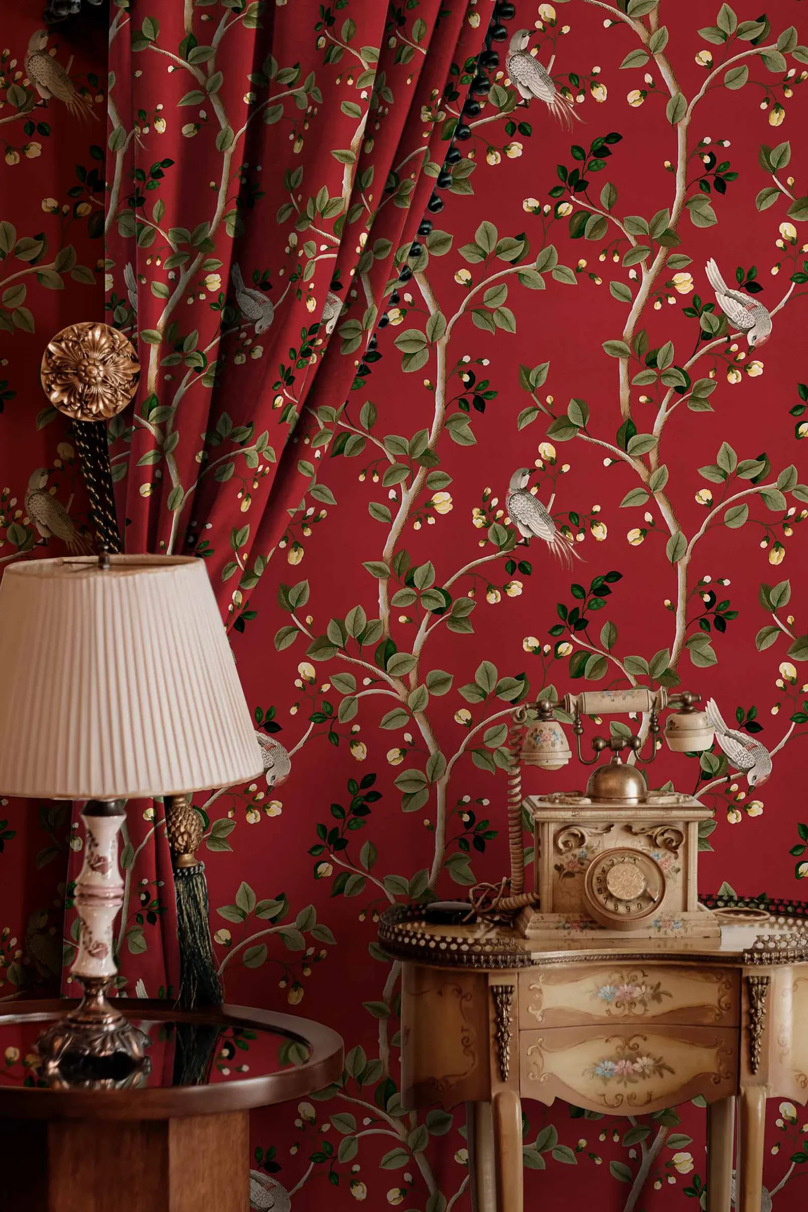La tela Birds Prosperity Ruby de Coordonné es un diseño de animales en rojo/blanco de la colección Forbidden City Fabrics.