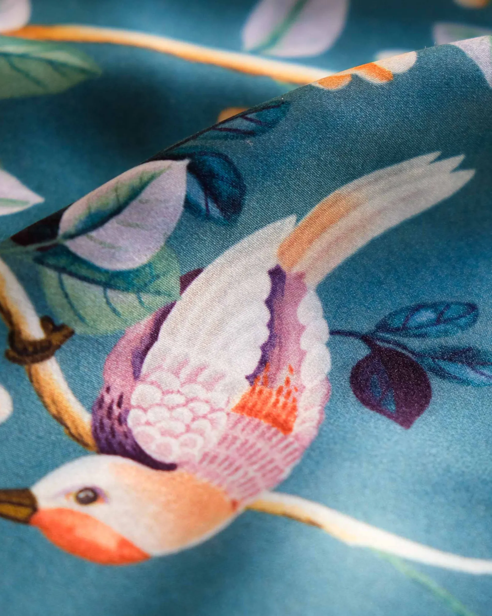 La tela Birds Prosperity Sapphire de Coordonné es un diseño de animales en azul/rosa de la colección Forbidden City Fabrics.