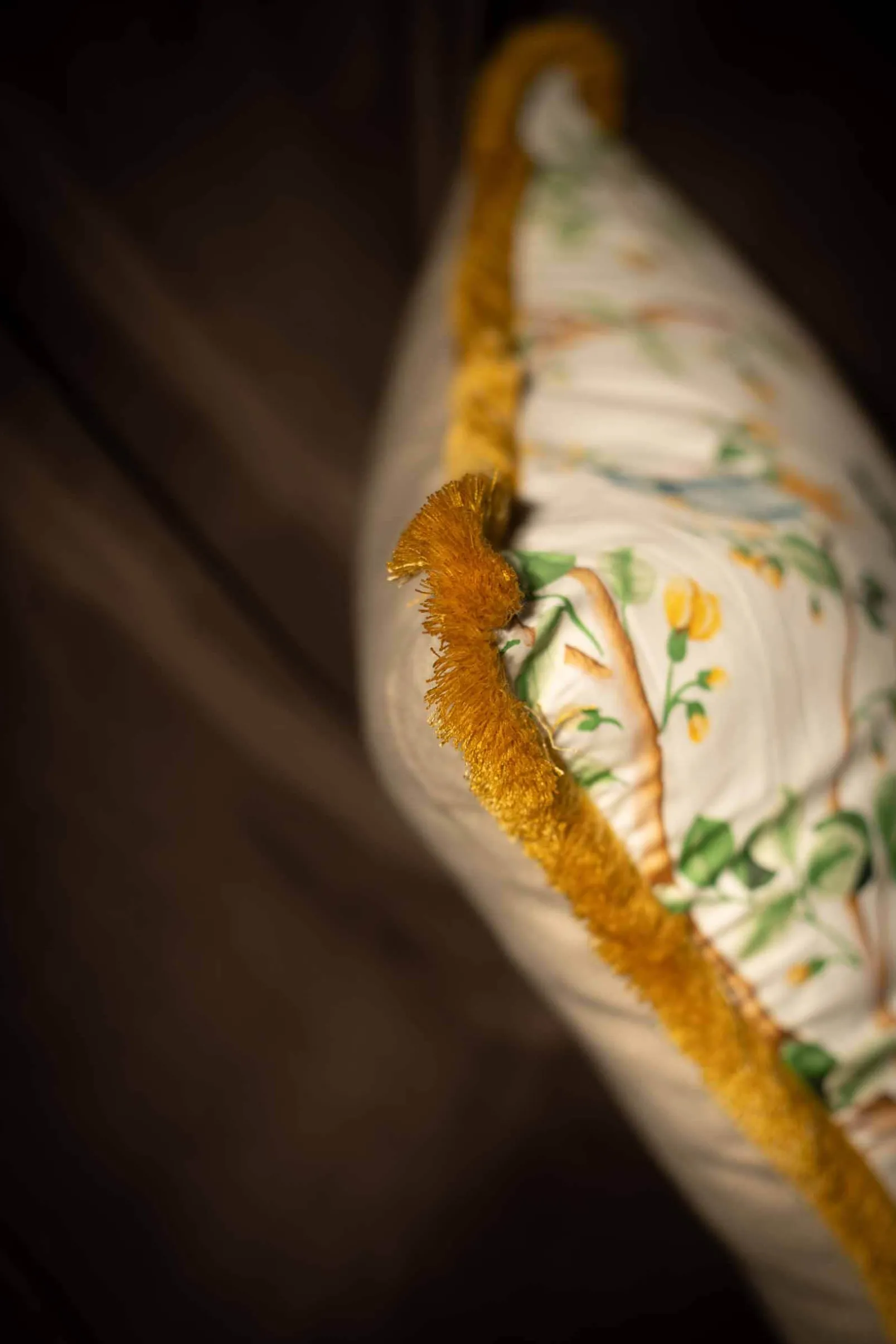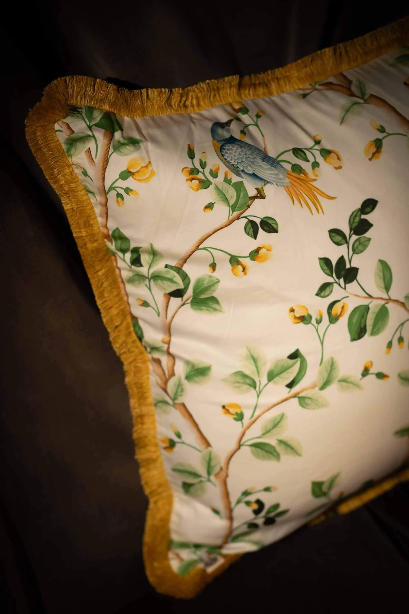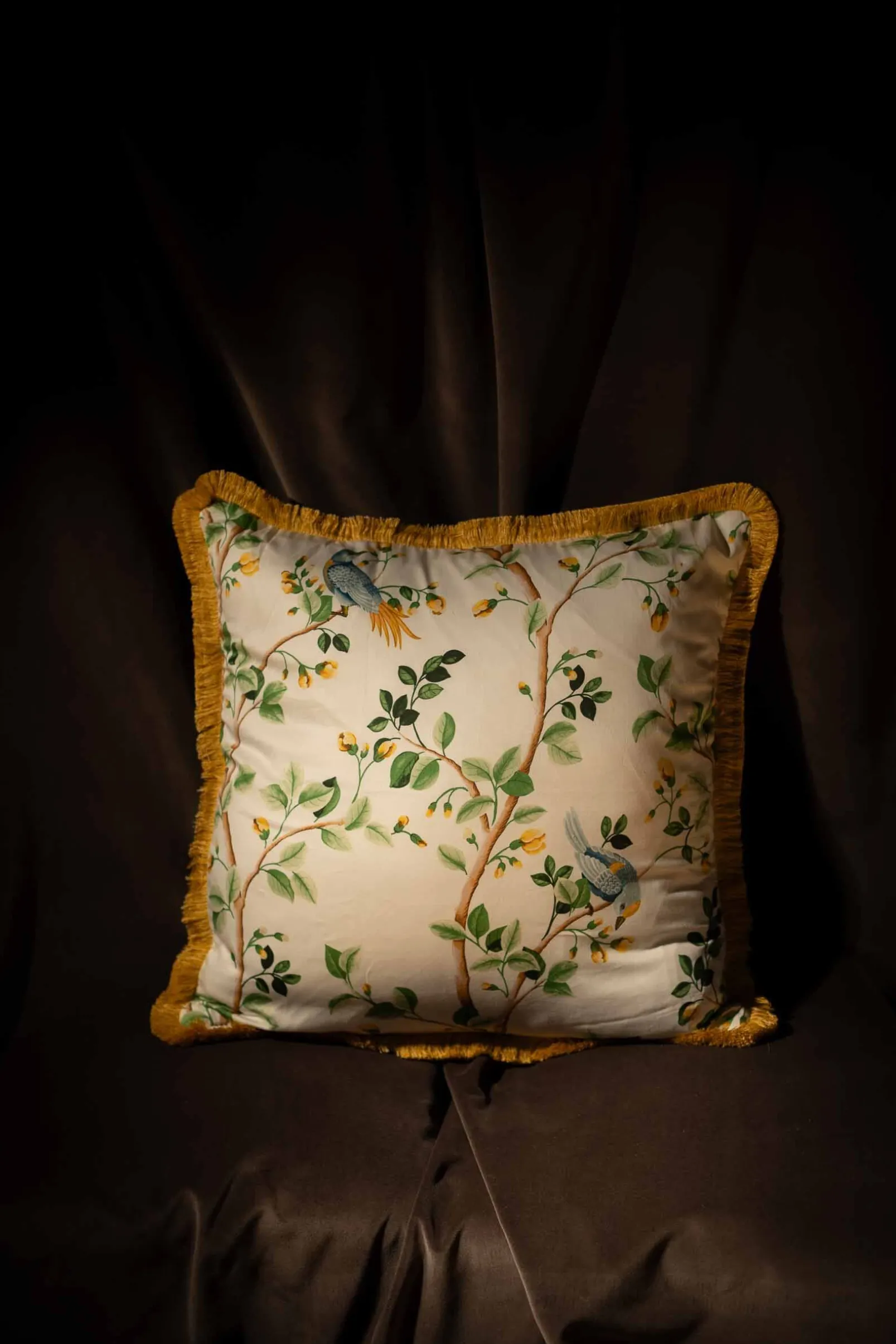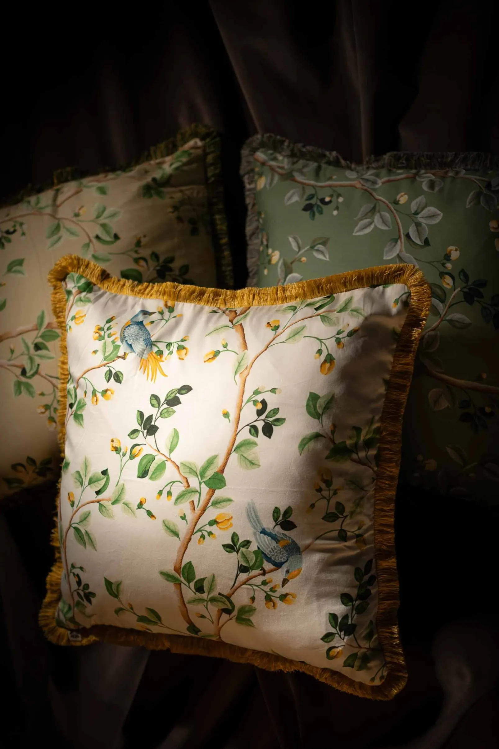 Birds Prosperity Swan de Coordonné es un diseño de inspiración floral en blanco/gris de la colección Ciudad Prohibida. Reverso en lino liso de tono neutro.