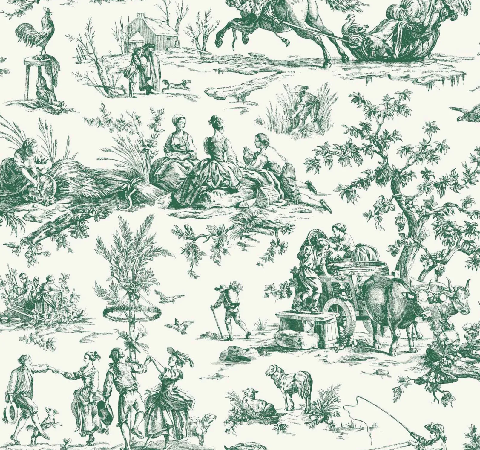 El papel pintado Bucolic Toile Emerald de Coordonné es un pueblo diseñado en tonos verdes de la colección Enchanted.
