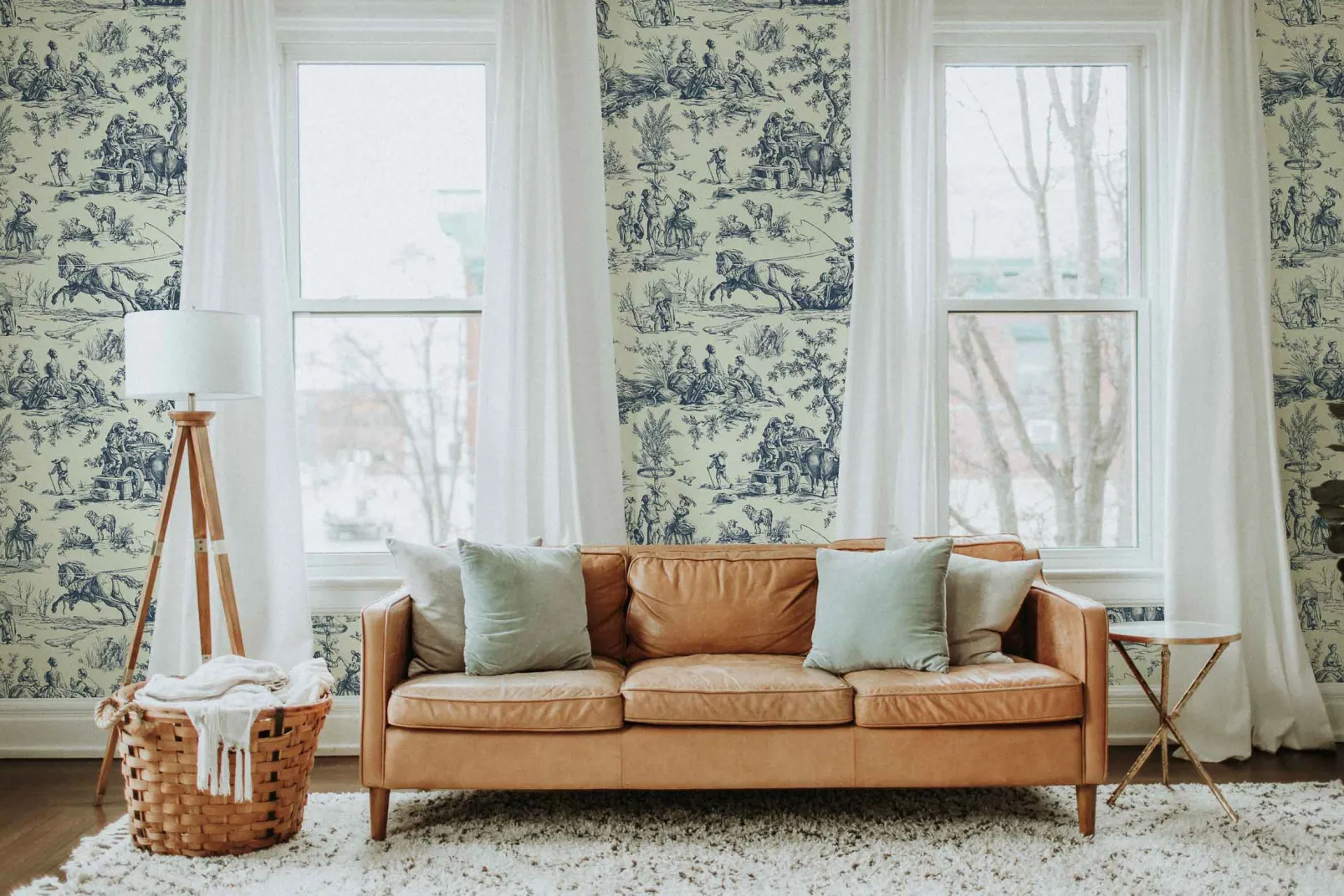 El papel pintado Bucolic Toile Indigo de Coordonné es un pueblo diseñado en tonos azules/azules de la colección Enchanted.