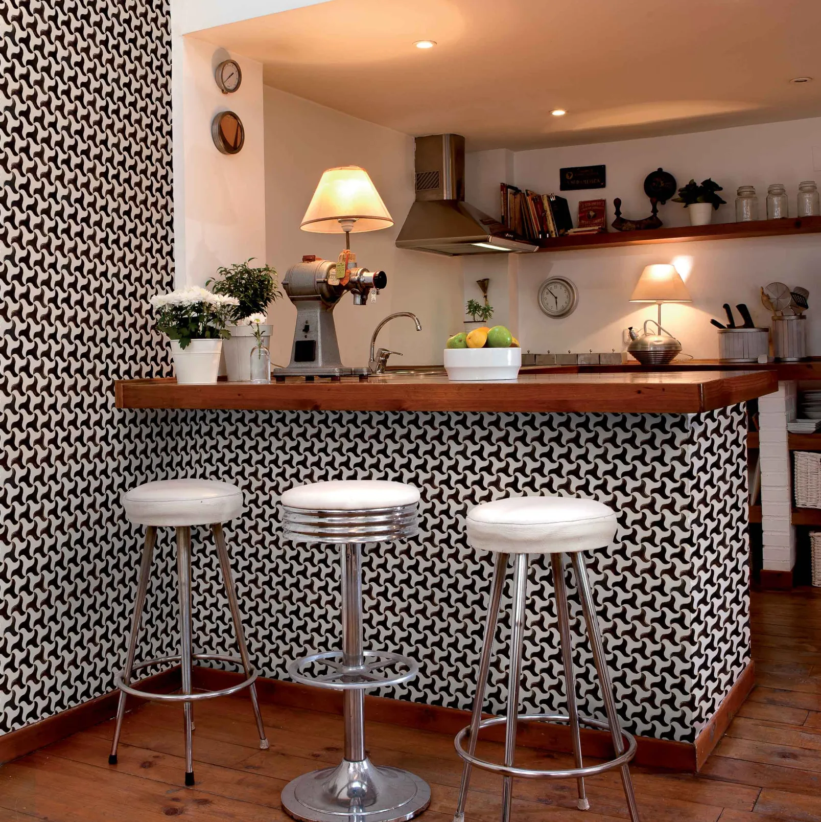 El papel pintado Cádiz de Coordonné es un diseño geométrico en tonos negros de la colección Tiles.