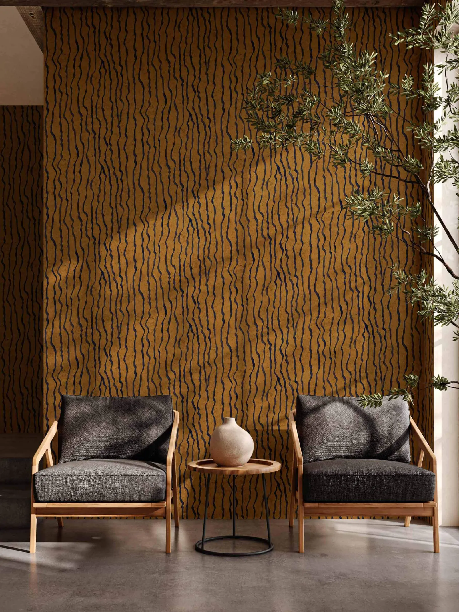 Calligraphy Amber de Coordonné es un papel pintado inspirado en la strpe en tonos amarillo/naranja.