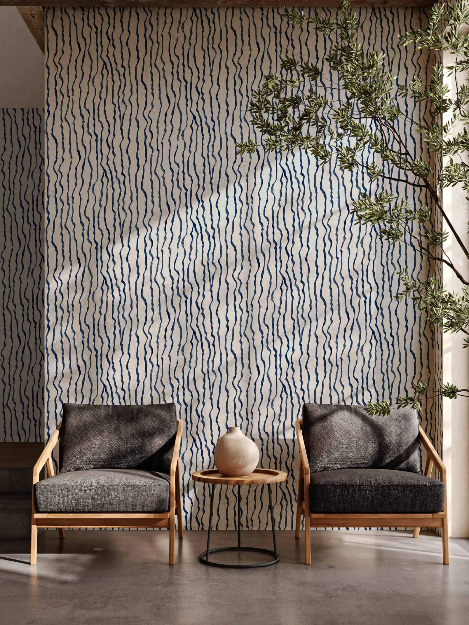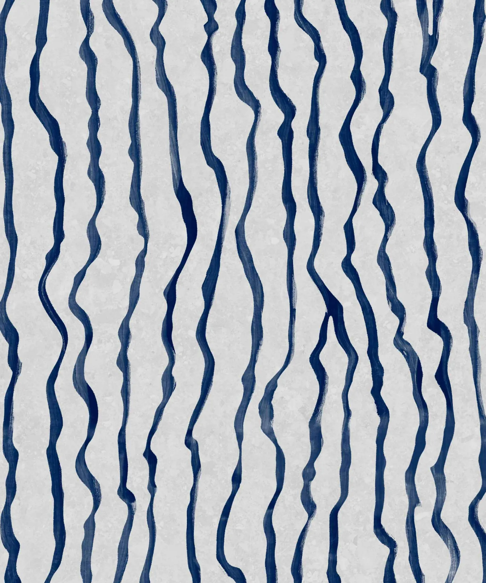 El papel pintado Calligraphy Klein de Coordonné es un papel pintado de inspiración strpe en tonos azul/azul marino.