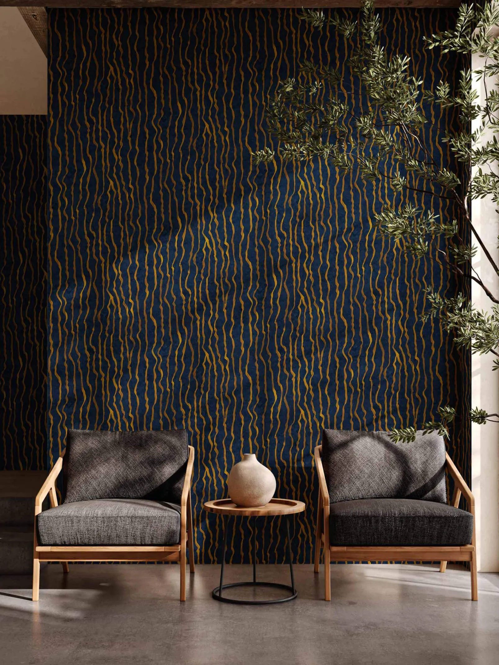 Calligraphy Lapislazuli de Coordonné es un papel pintado de inspiración strpe en tonos azul/azul marino.
