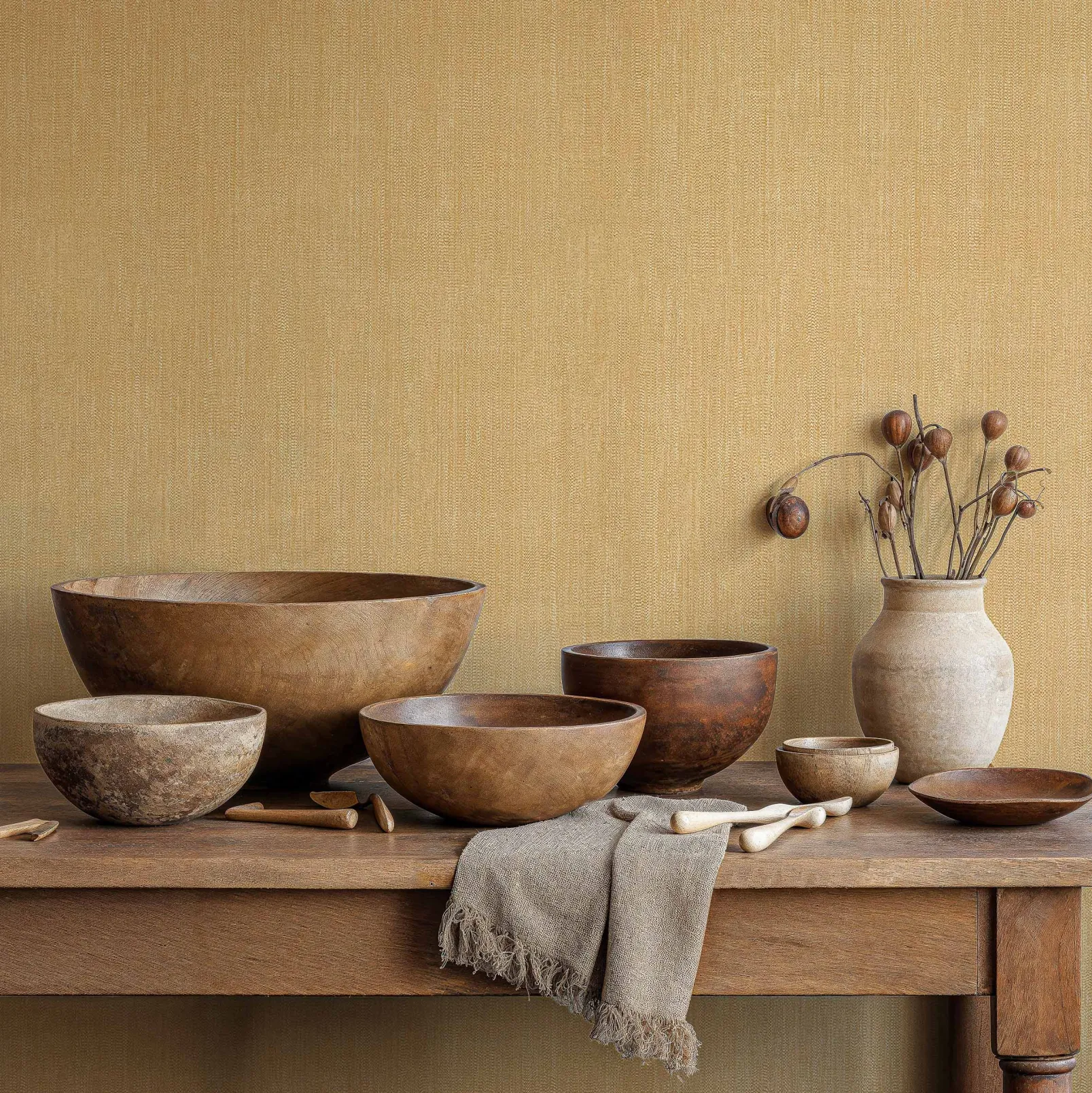 Cáñamo 5 de Coordonné es un diseño liso en amarillo/naranja de la colección Tactus. Textura vegetal rugosa e irregular.