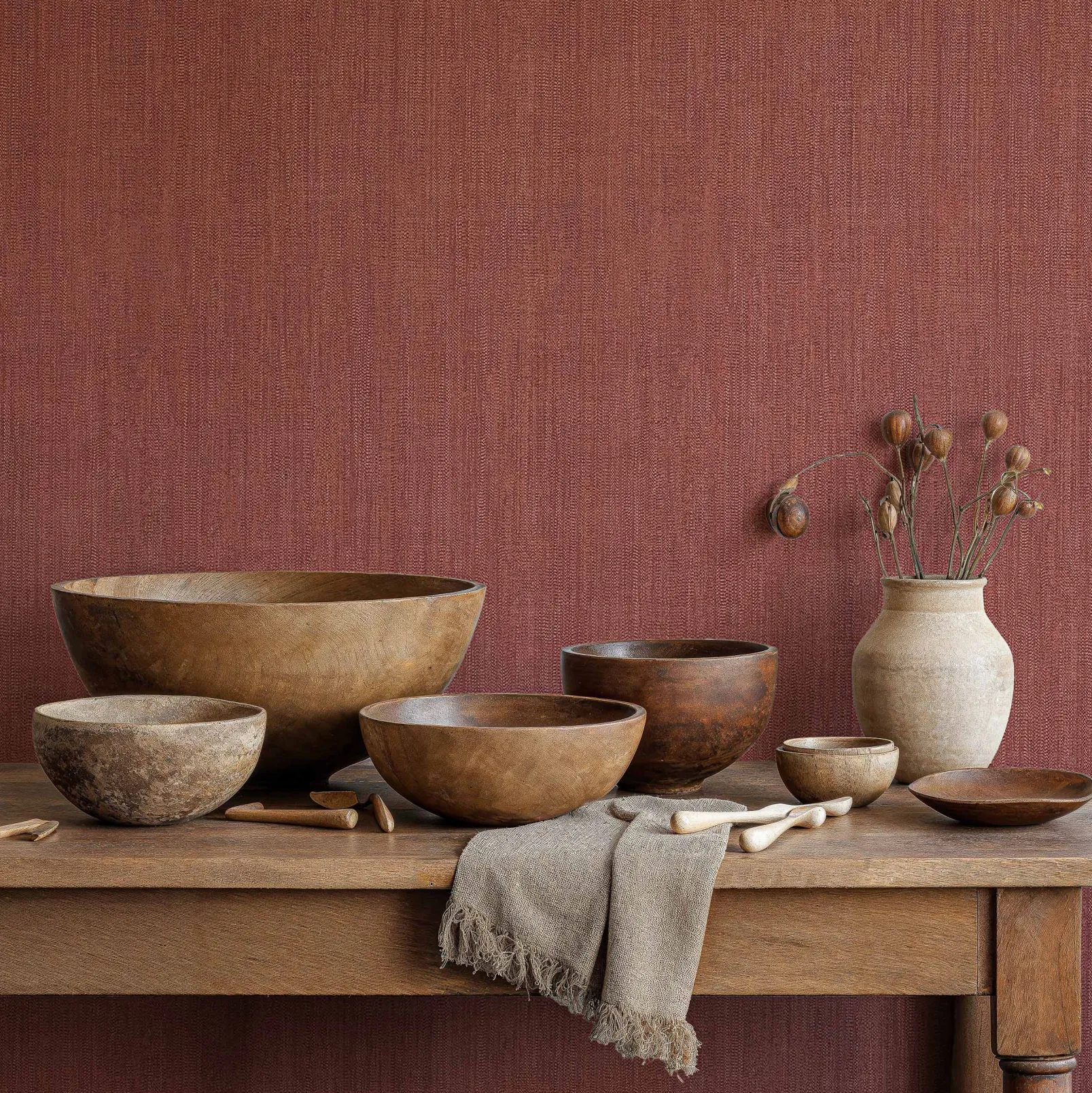 Cáñamo 9 de Coordonné es un diseño liso en rojo/vino de la colección Tactus. Textura vegetal rugosa e irregular.
