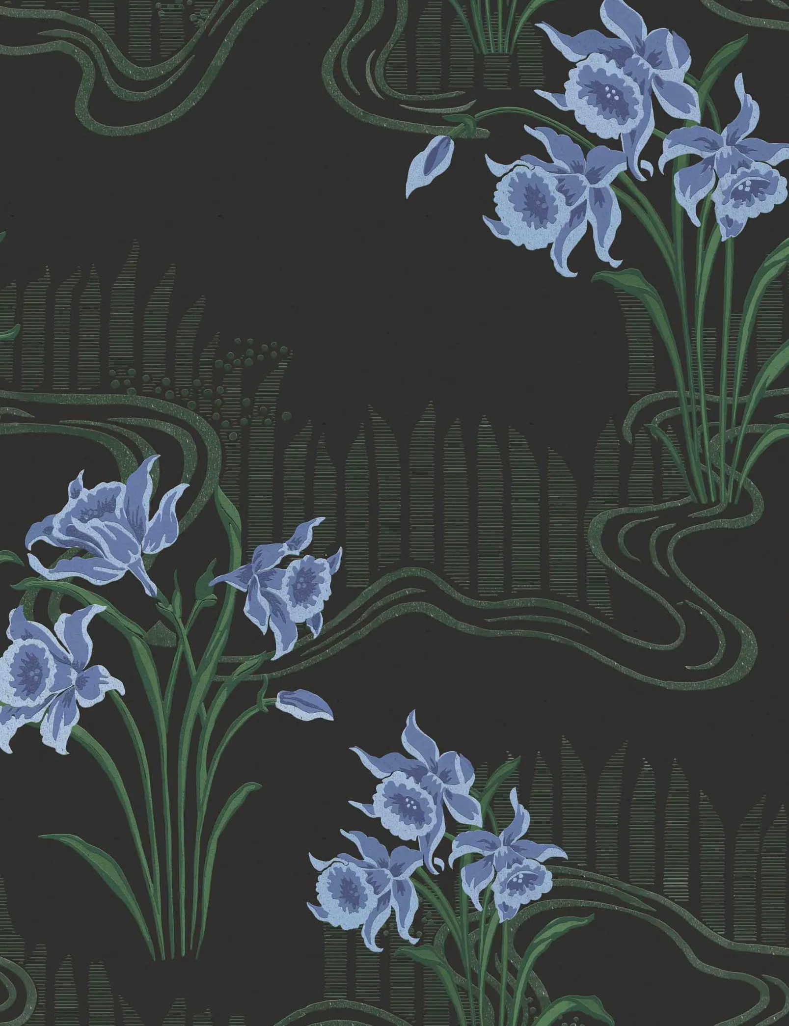 Candela Azabache de Coordonné es un diseño floral en negro de la colección Feria. Orgullosos lirios silvestres entre los estanques.