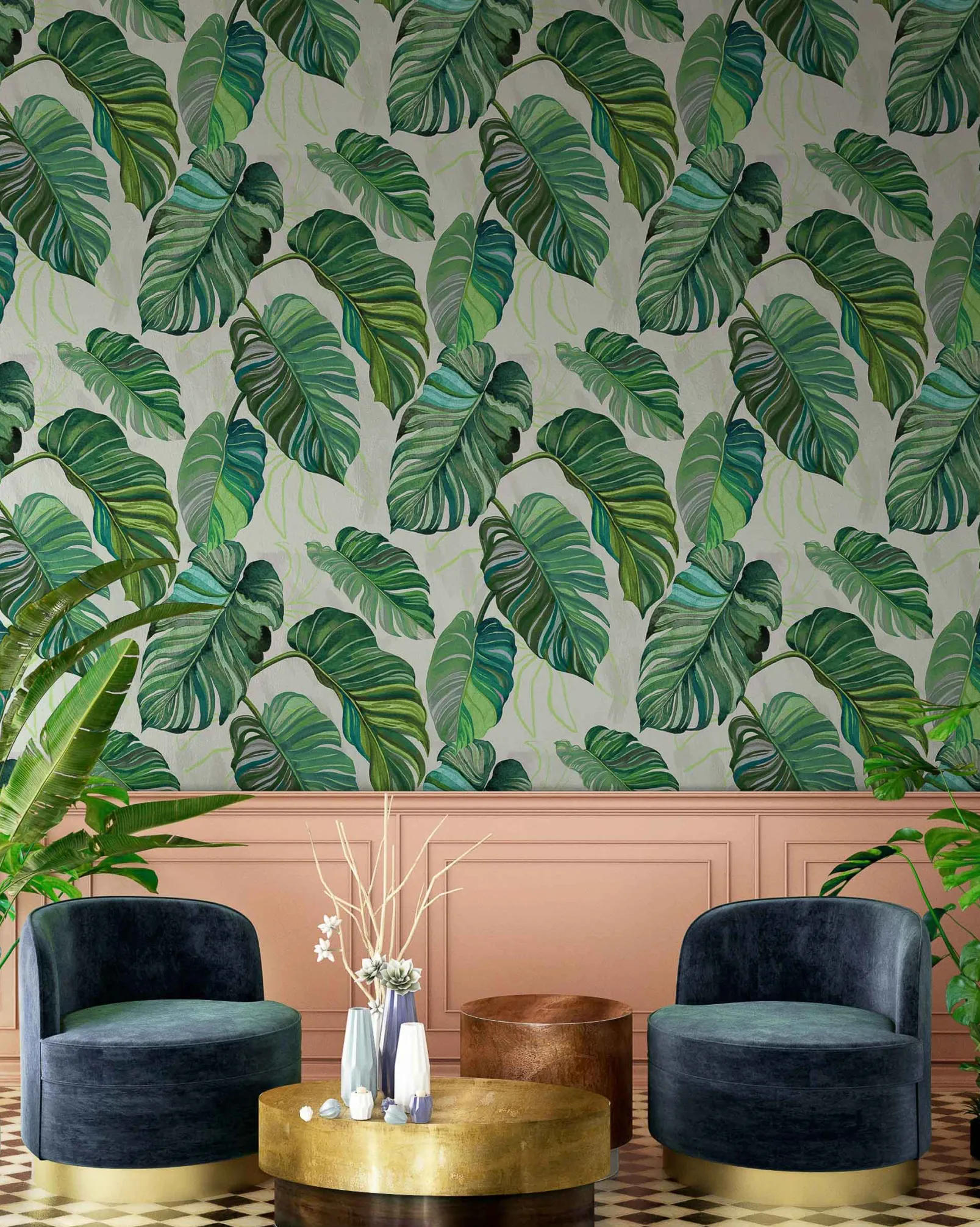 El papel pintado Carioca Green de Coordonné es un diseño vegetal en tonos verdes de la colección Wander.